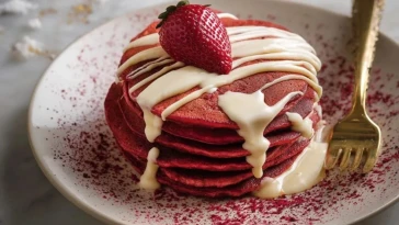 Rote Samt-Pfannkuchen für ein süßes Valentinstags-Frühstück