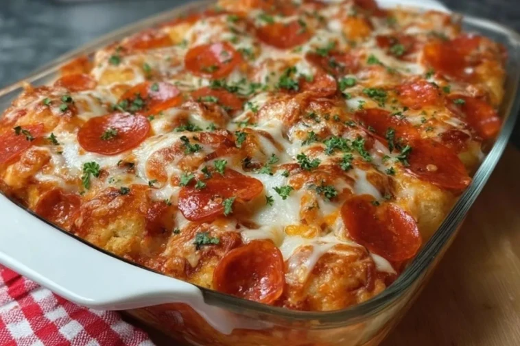 Pizzateig bildet die lockere, sättigende Grundlage und sorgt dafür, dass der Auflauf wie eine besonders weiche, ofengebackene Pizza schmeckt.