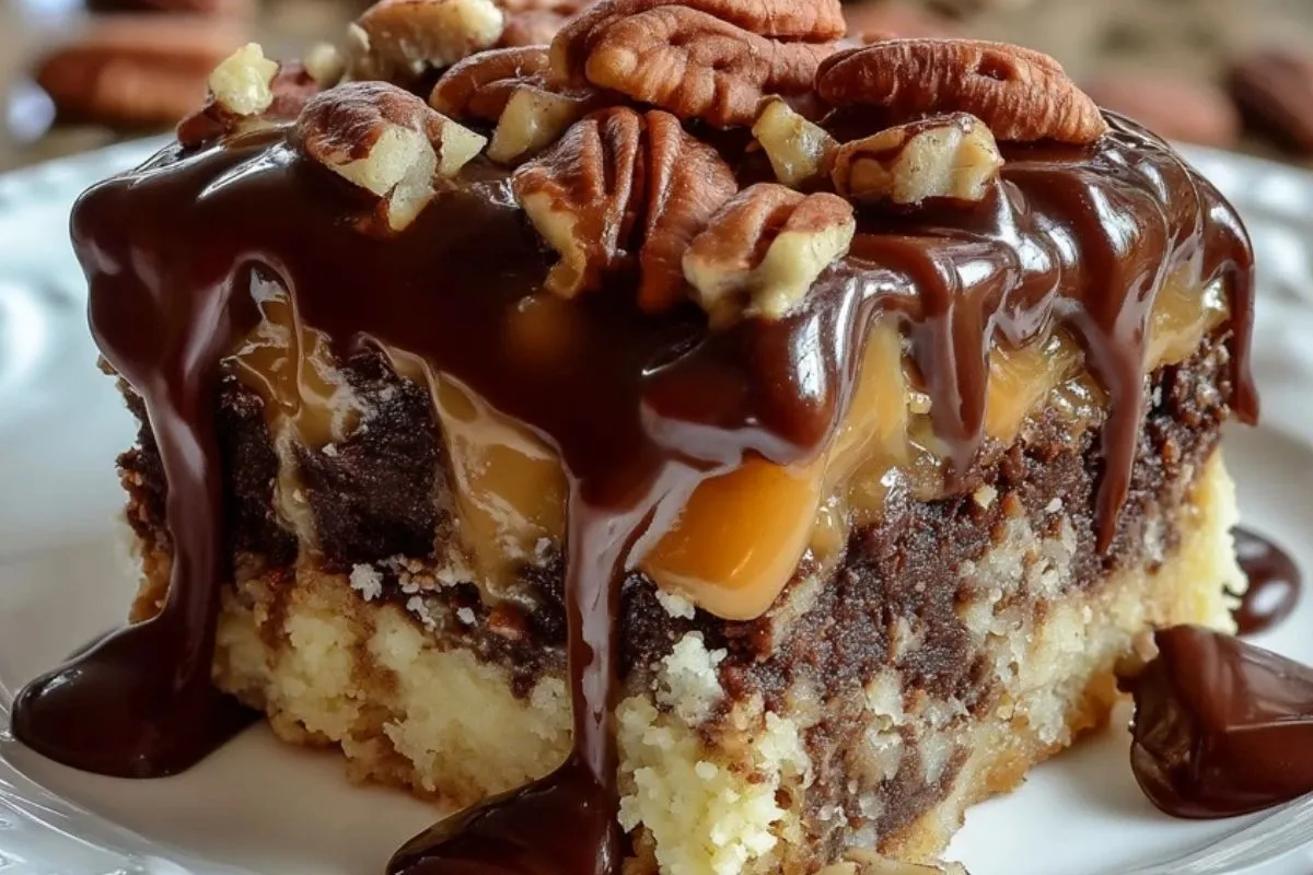 Schokoladenkuchen mit Karamell und Pekannüssen