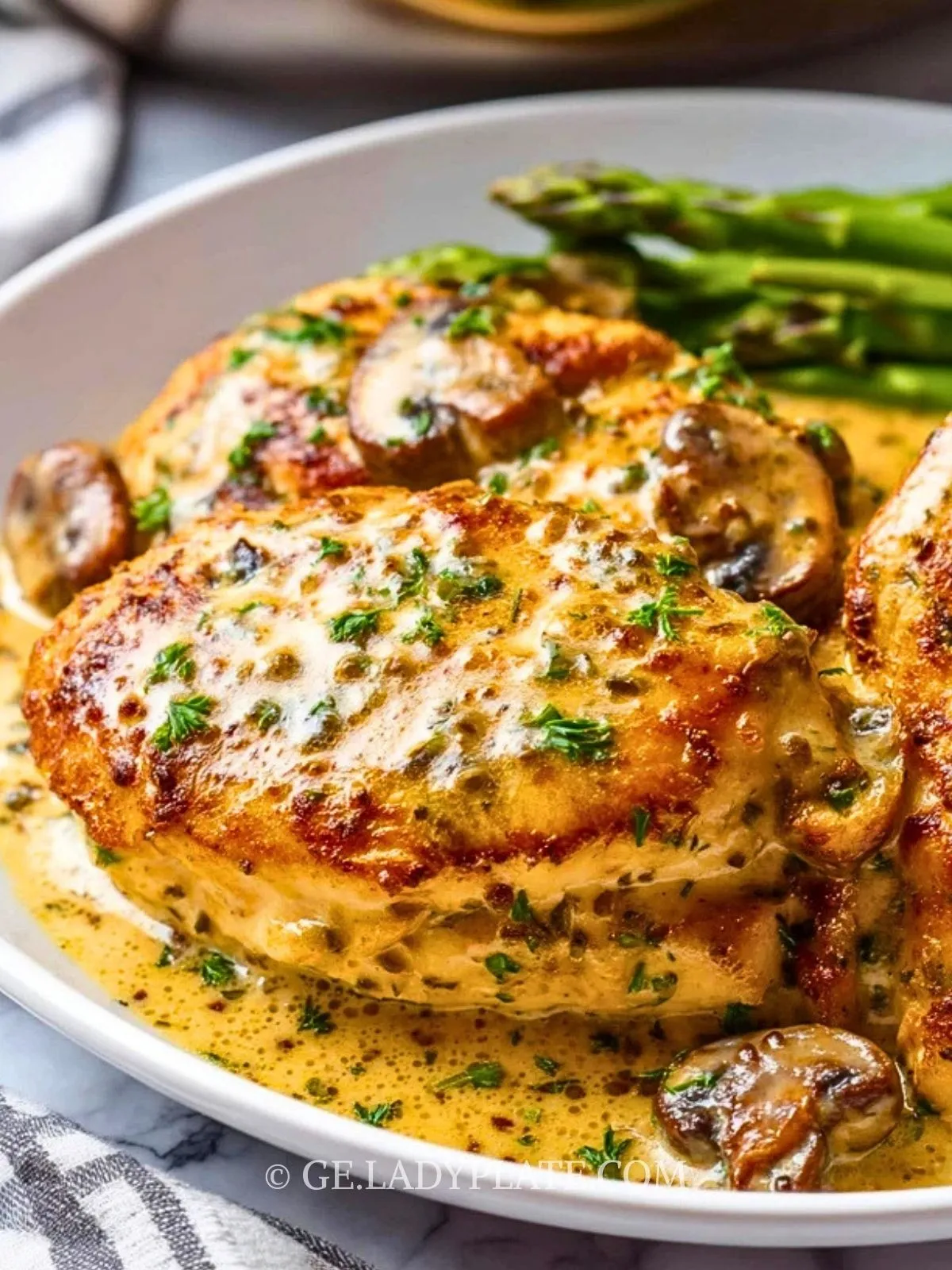 Die Hähnchenfilets zurück in die Pfanne legen, mit der Sauce überziehen und alles zusammen bei niedriger Hitze noch 5 Minuten ziehen lassen. Mit gehackter Petersilie bestreuen und servieren.
