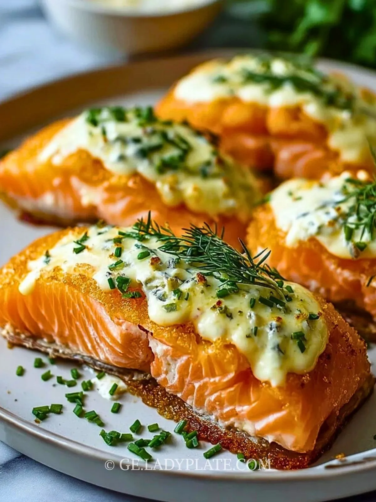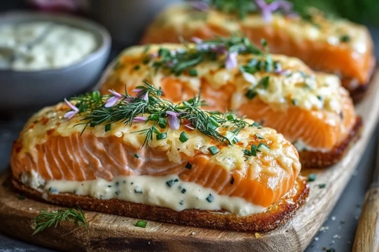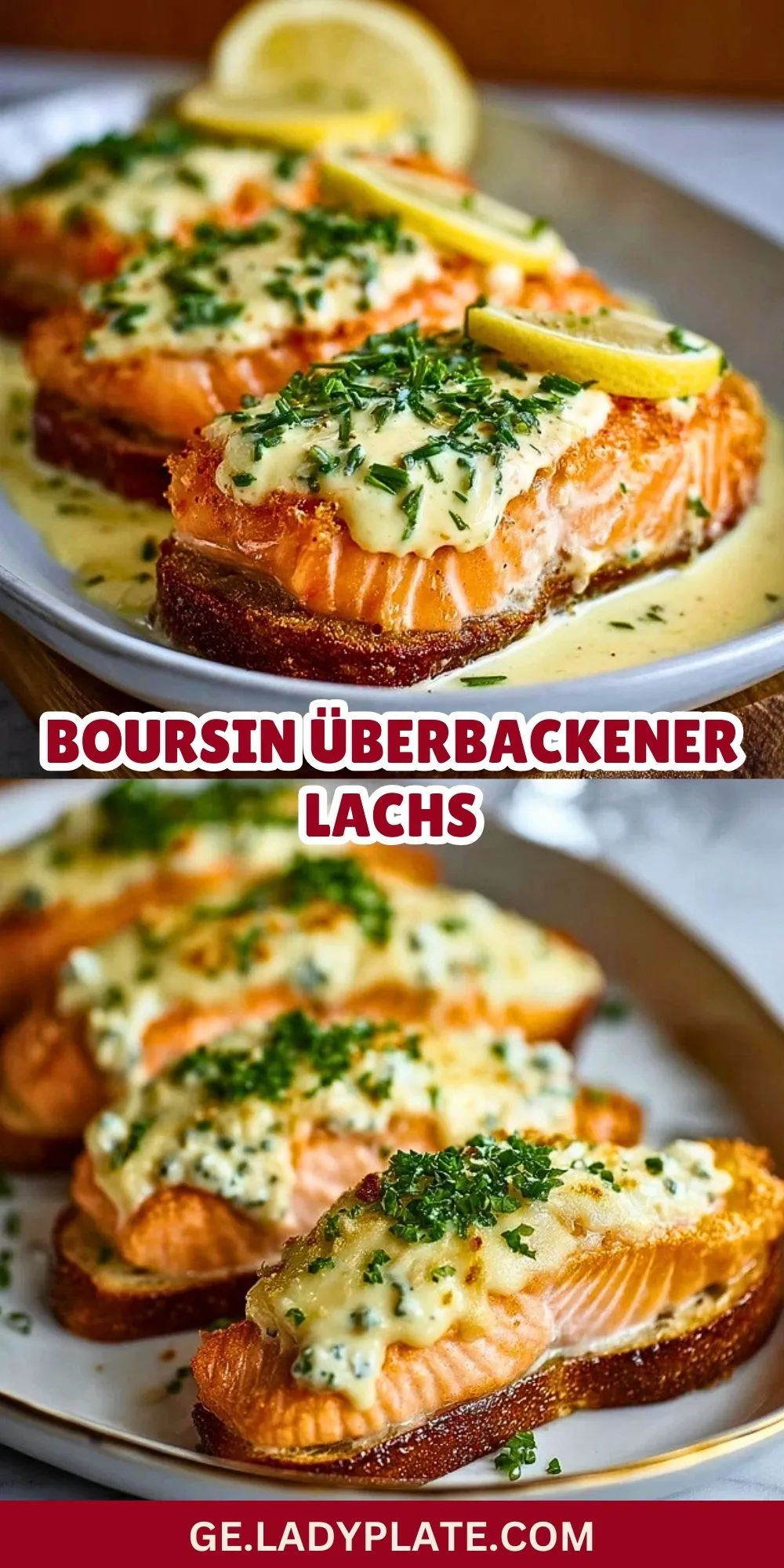 Saftiger Lachs auf knusprigem Brot, verfeinert mit cremigem Boursin-Käse und frischen Kräutern – überbacken bis zur goldenen Perfektion. Das perfekte Gericht für Gäste oder einen luxuriösen Feierabend.