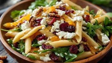 Gesunder Penne-Salat mit Feta, Cranberries und Orangen-Vinaigrette