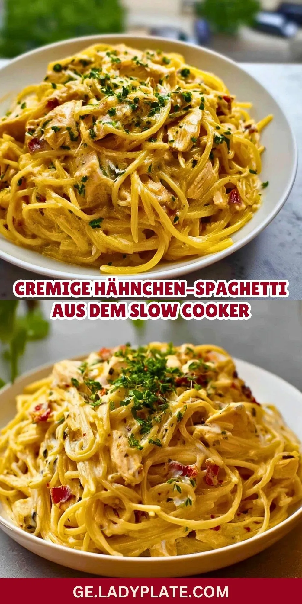 Cremige Hähnchen-Spaghetti aus dem Slow Cooker sind das perfekte Wohlfühlgericht: Zartes Hähnchenfleisch in einer herrlich cremigen Sauce mit Pasta, Knoblauch und Parmesan. Einfache Zubereitung und maximaler Genuss – ideal für stressige Tage!
