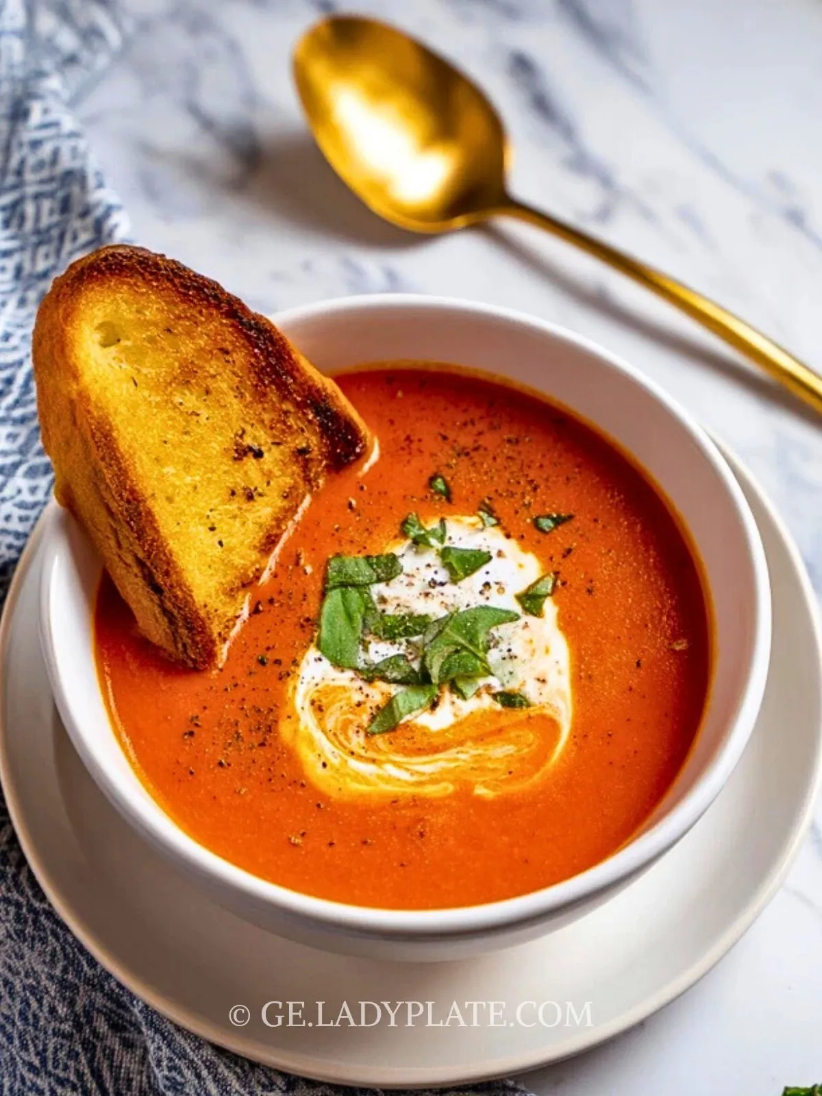Fülle die heiße Suppe in Schalen und garniere sie mit frischem Basilikum, etwas Sahne oder frisch gemahlenem Pfeffer. Dazu passt geröstetes Brot, Croûtons oder ein knuspriges Sandwich.