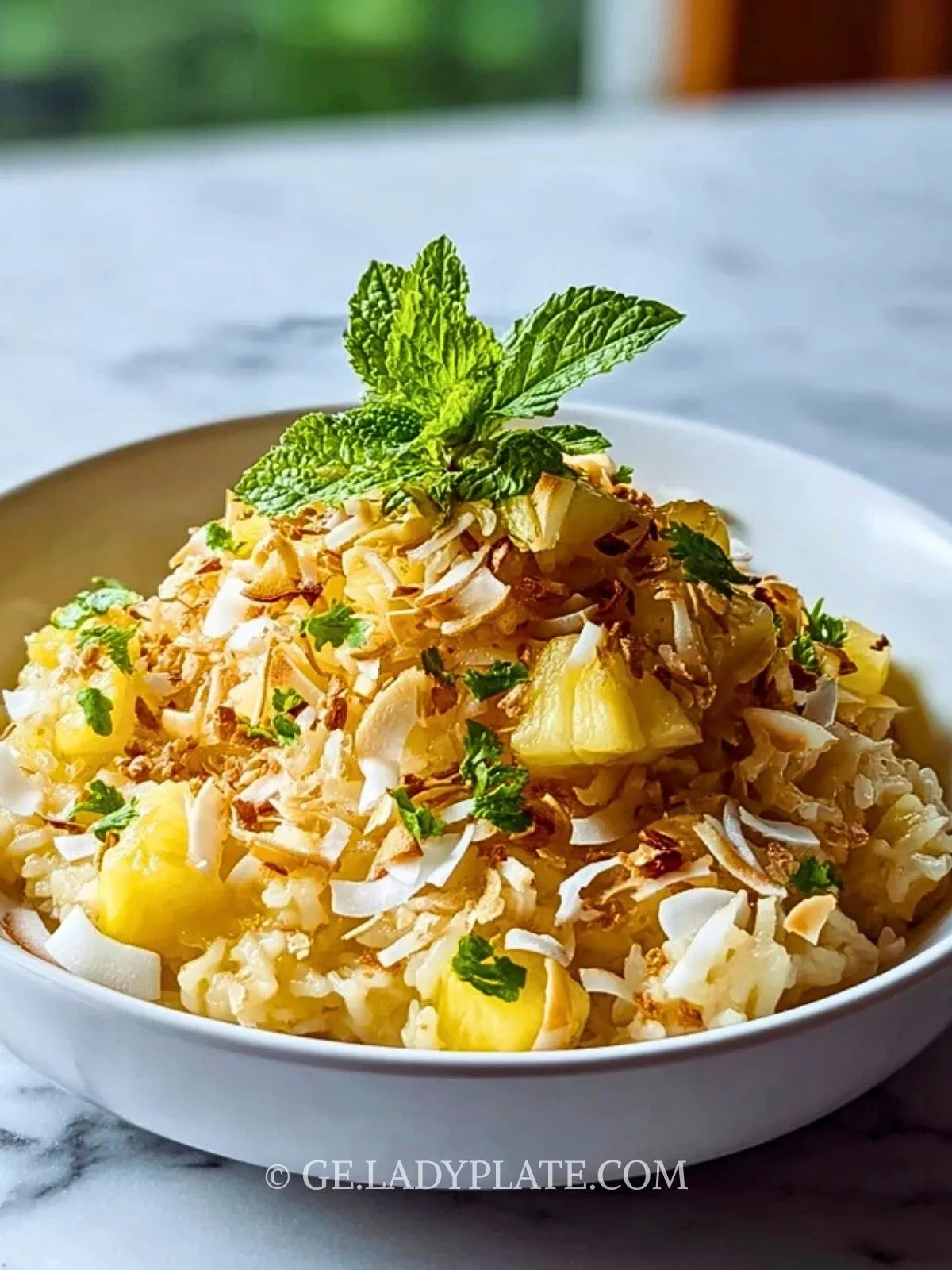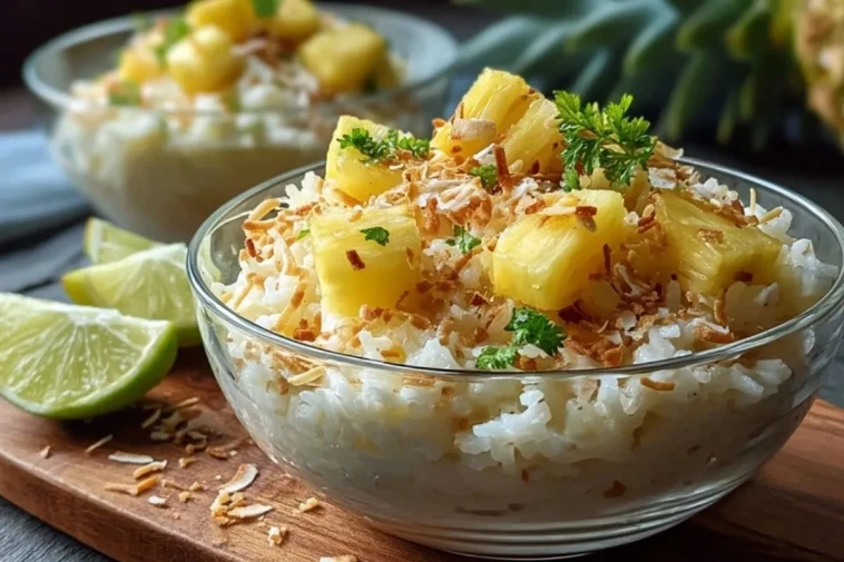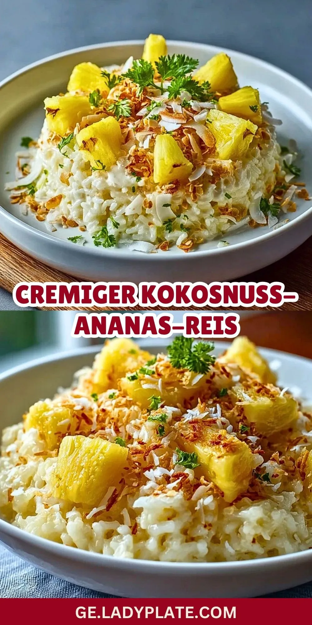 Ein cremiger, exotischer Kokosnuss-Ananas-Reis, der nach Urlaub schmeckt! Zarter Jasminreis wird in Kokosmilch gekocht, mit frischer Ananas, Limette und gerösteten Kokosraspeln serviert. Perfekt als Dessert, süßes Frühstück oder als tropische Beilage zu asiatischen Gerichten.