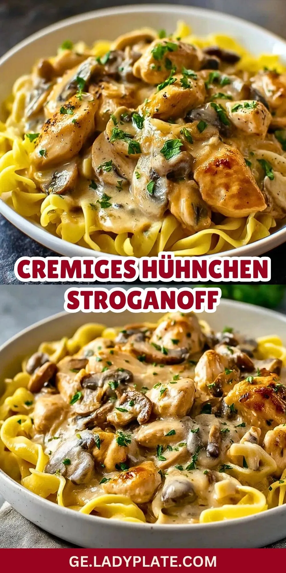 Die frisch gekochten Nudeln auf Tellern verteilen, das cremige Hühnchen Stroganoff darüber geben und mit gehackter Petersilie bestreuen.