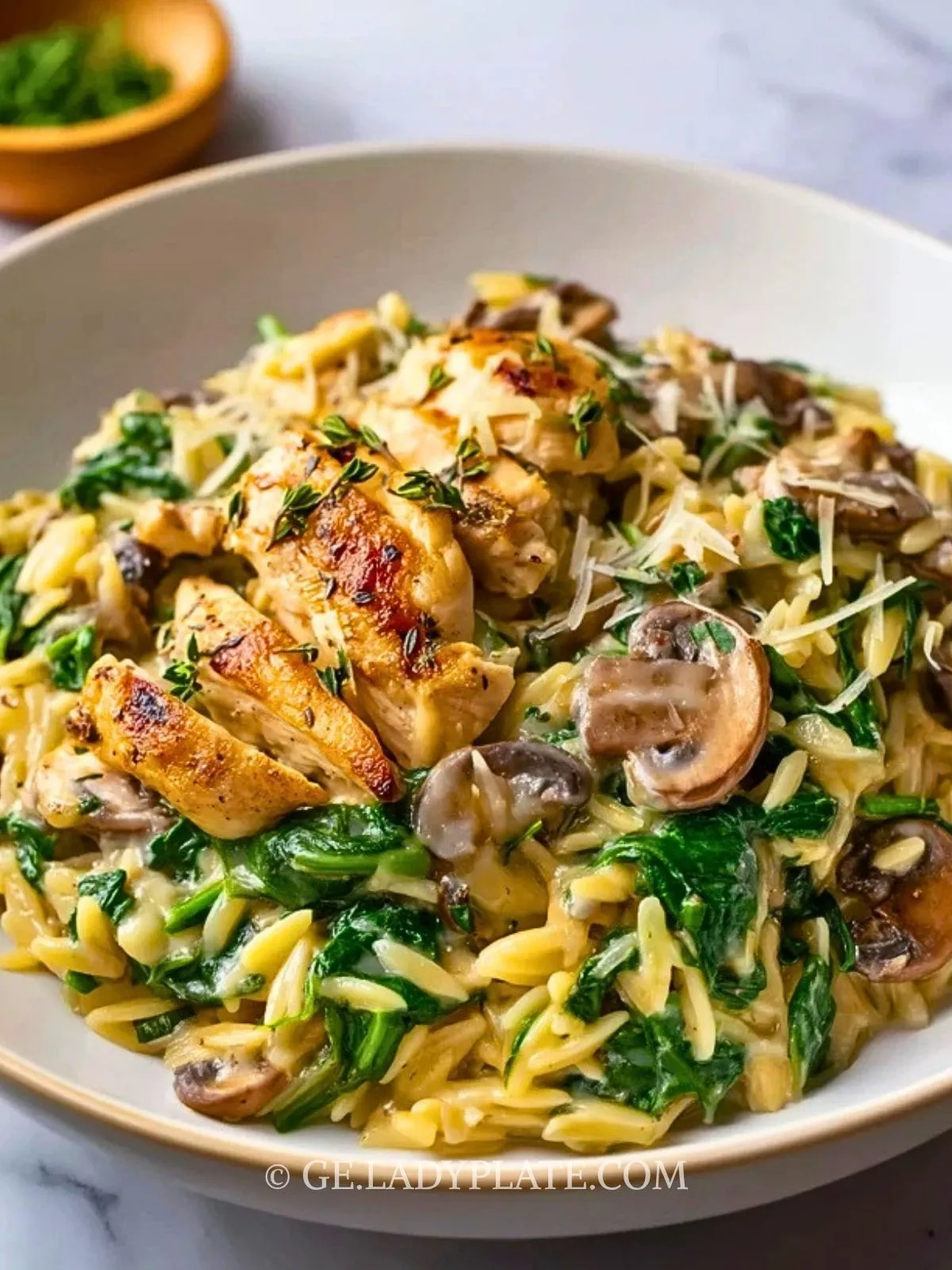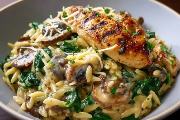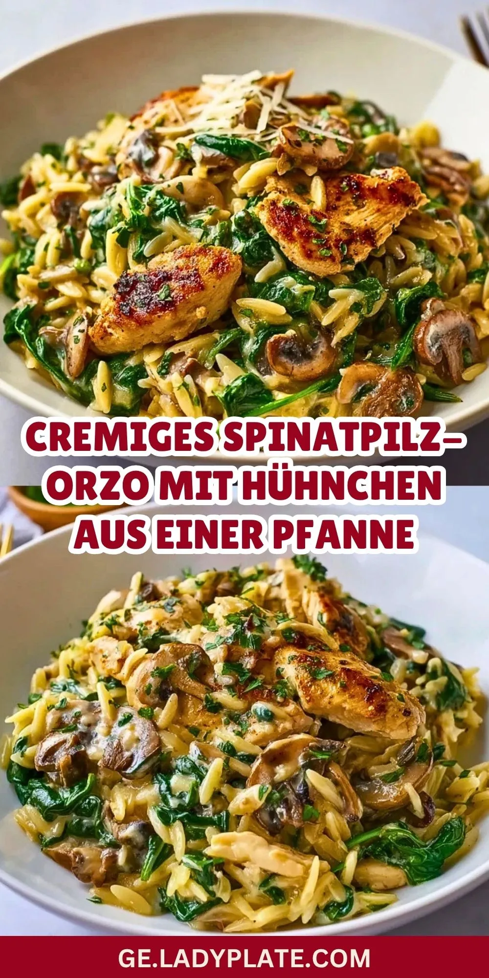 Cremiges Spinatpilz-Orzo mit Hühnchen aus einer Pfanne ist ein herzhaftes Wohlfühlgericht, das zart gebratenes Hühnchen, würzige Champignons, frischen Spinat und sämigen Orzo in einer einzigen Pfanne vereint. Die kleinen Nudeln nehmen beim Garen den Geschmack der Brühe und Gewürze auf, während Sahne und Parmesan für eine besonders cremige, aromatische Sauce sorgen.
