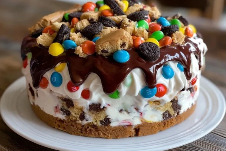 Ein cremiger, extra schokoladiger Eiscreme-Kuchen mit knusprigem Keksboden, bunten M&Ms, soften Schokoladenkeksteig-Stücken und glänzender Ganache. Perfekt für Geburtstage, Sommerfeste oder immer dann, wenn du ein auffälliges Dessert servieren möchtest, das sich gut vorbereiten lässt.