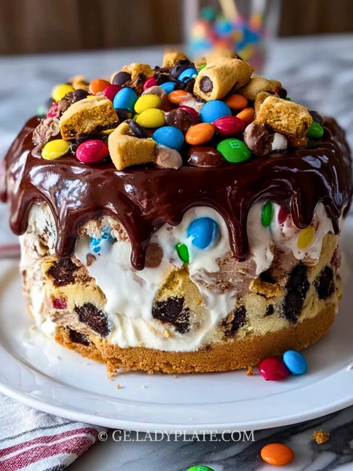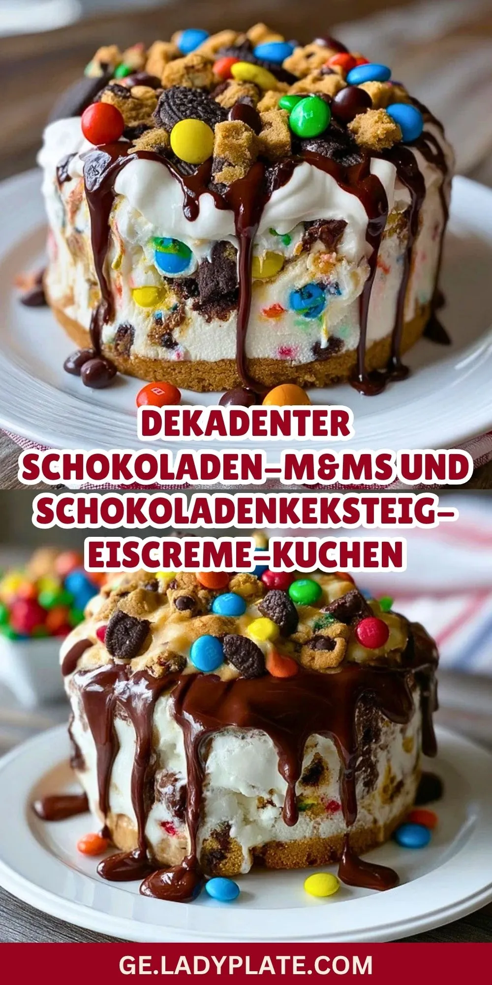 Dekadenter Schokoladen-M&Ms und Schokoladenkeksteig-Eiscreme-Kuchen