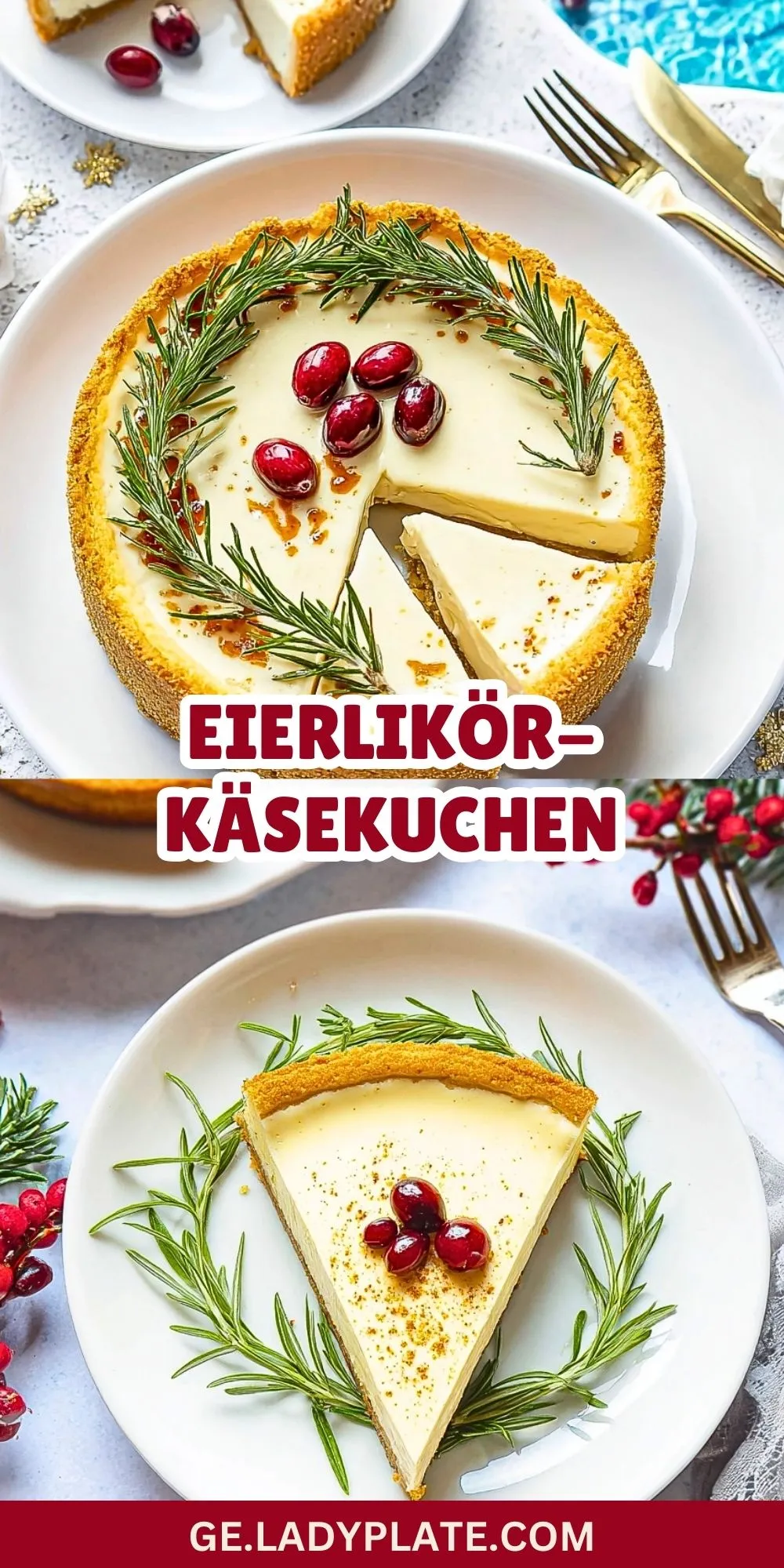 Ein cremiger Eierlikör-Käsekuchen bringt die perfekte Mischung aus feinem Käsekuchengenuss und dem besonderen Aroma des Eierlikörs auf deine Kaffeetafel. Mit seinem herrlich saftigen Inneren und einer leicht knusprigen Keksboden-Basis begeistert er nicht nur zur Osterzeit, sondern ist auch im Winter ein echter Favorit. Dekoriert mit frischem Rosmarin und roten Beeren macht dieser Käsekuchen optisch richtig was her – ein Hingucker auf jedem Fest.
