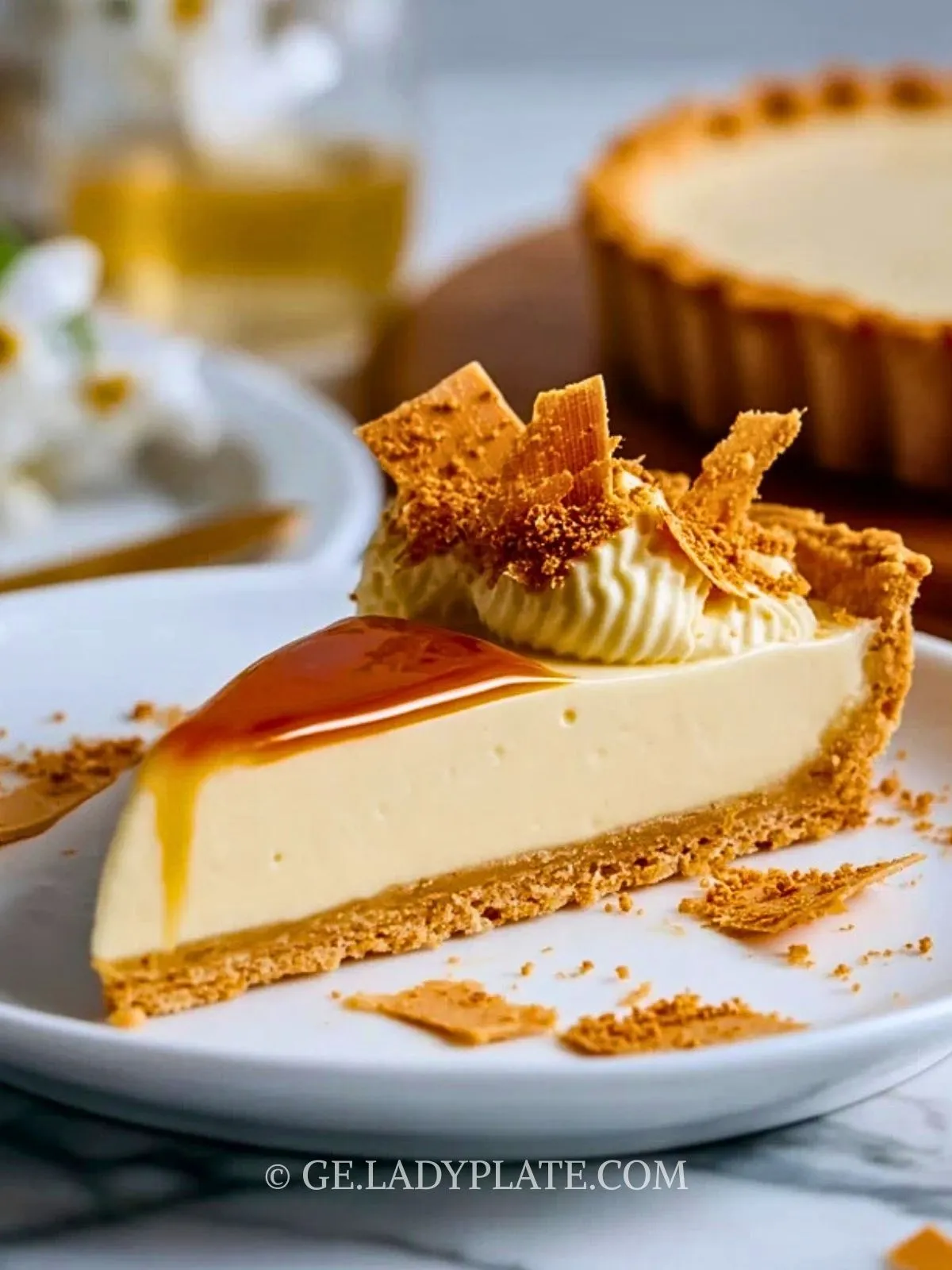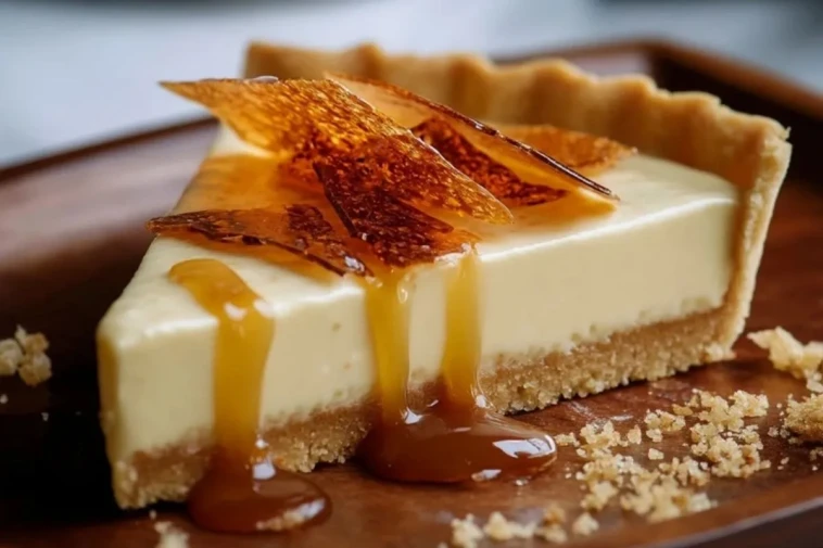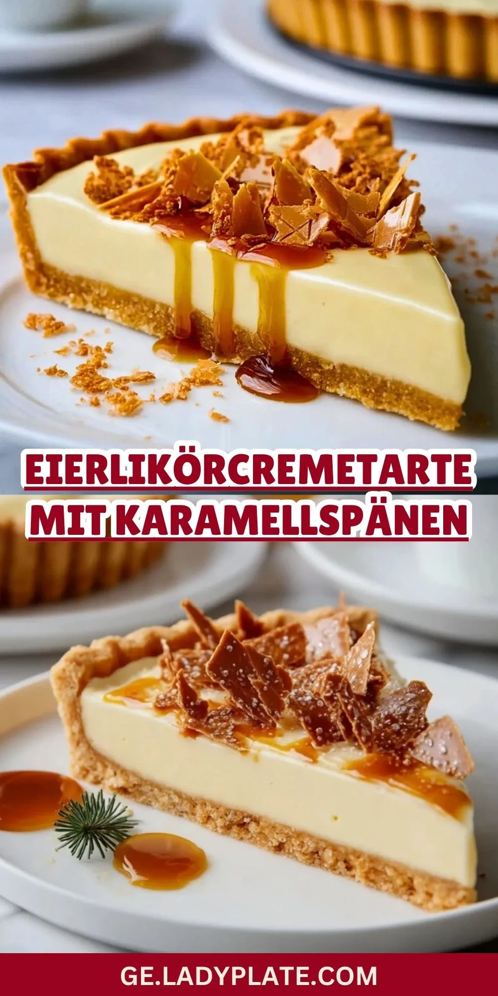 Diese Eierlikörcremetarte mit Karamellspänen kombiniert einen knusprigen Keksboden, eine seidige Eierlikörcreme und goldene Karamellsoße zu einem eleganten Dessert, das sich perfekt für festliche Anlässe vorbereiten lässt.