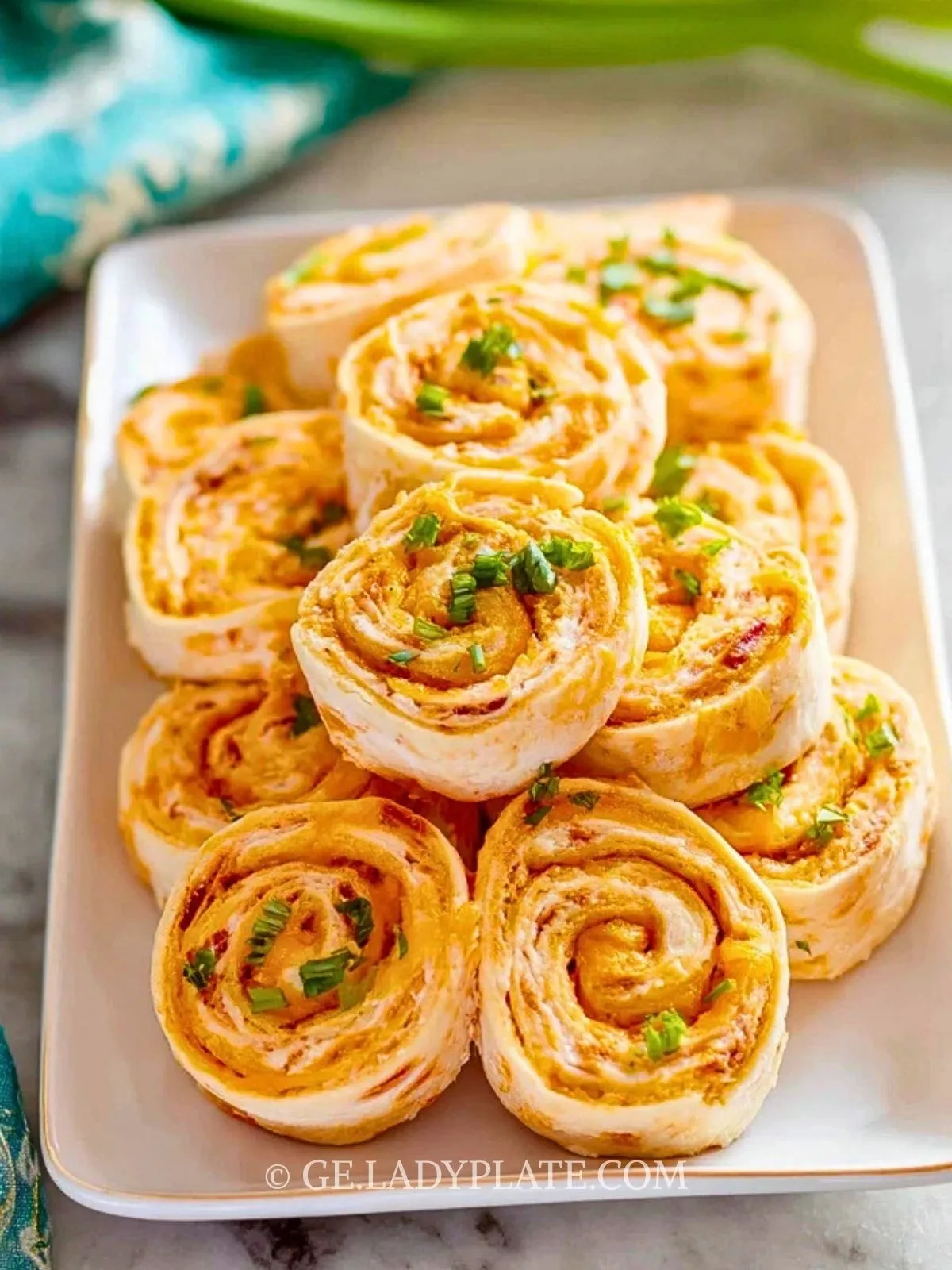 Die Buffalo-Hühnchen-Röllchen auf einer Platte anrichten und nach Wunsch mit zusätzlichen Frühlingszwiebeln garnieren.