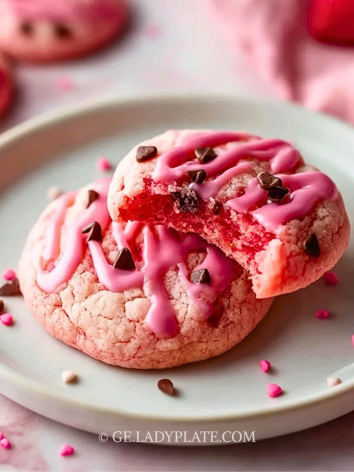 Am besten schmecken diese Erdbeerplätzchen frisch, wenn die Oberfläche noch leicht zart und die Mitte weich ist. Du kannst sie wunderbar mit Kaffee, Tee, heißer Schokolade oder einem Glas kalter Milch servieren. Für den Valentinstag sehen sie besonders schön auf einer hellen Platte oder in kleinen Geschenktüten mit Schleife aus.