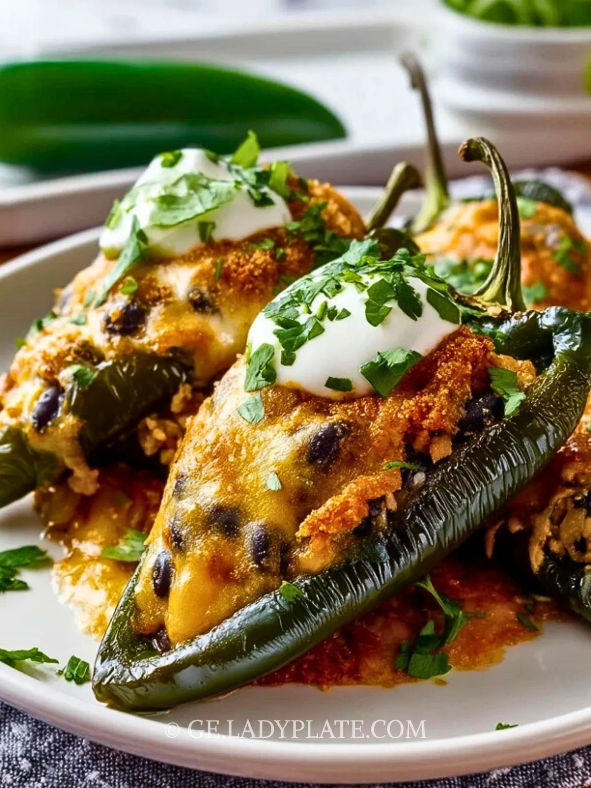 Herzhafte grüne Paprika werden mit einer würzigen Mischung aus Hackfleisch, Reis, schwarzen Bohnen, Tomaten und Käse gefüllt und im Ofen goldbraun gebacken. Getoppt mit Sauerrahm und frischen Kräutern bringen diese Chili Rellenos echtes mexikanisches Soulfood auf deinen Tisch – einfach, aromatisch und sättigend.