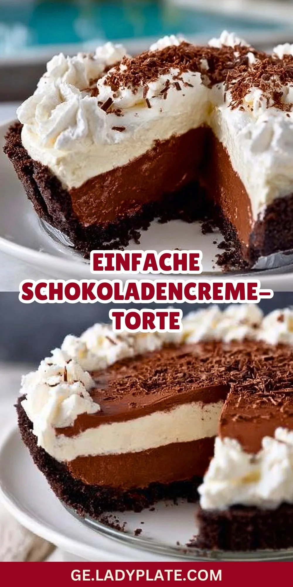 Diese einfache Schokoladencreme-Torte vereint einen knusprigen Keksboden mit einer luftigen Schokoladencreme und einem cremigen Sahnetopping. Perfekt für Schoko-Liebhaber und jede Gelegenheit – ganz ohne Backen!