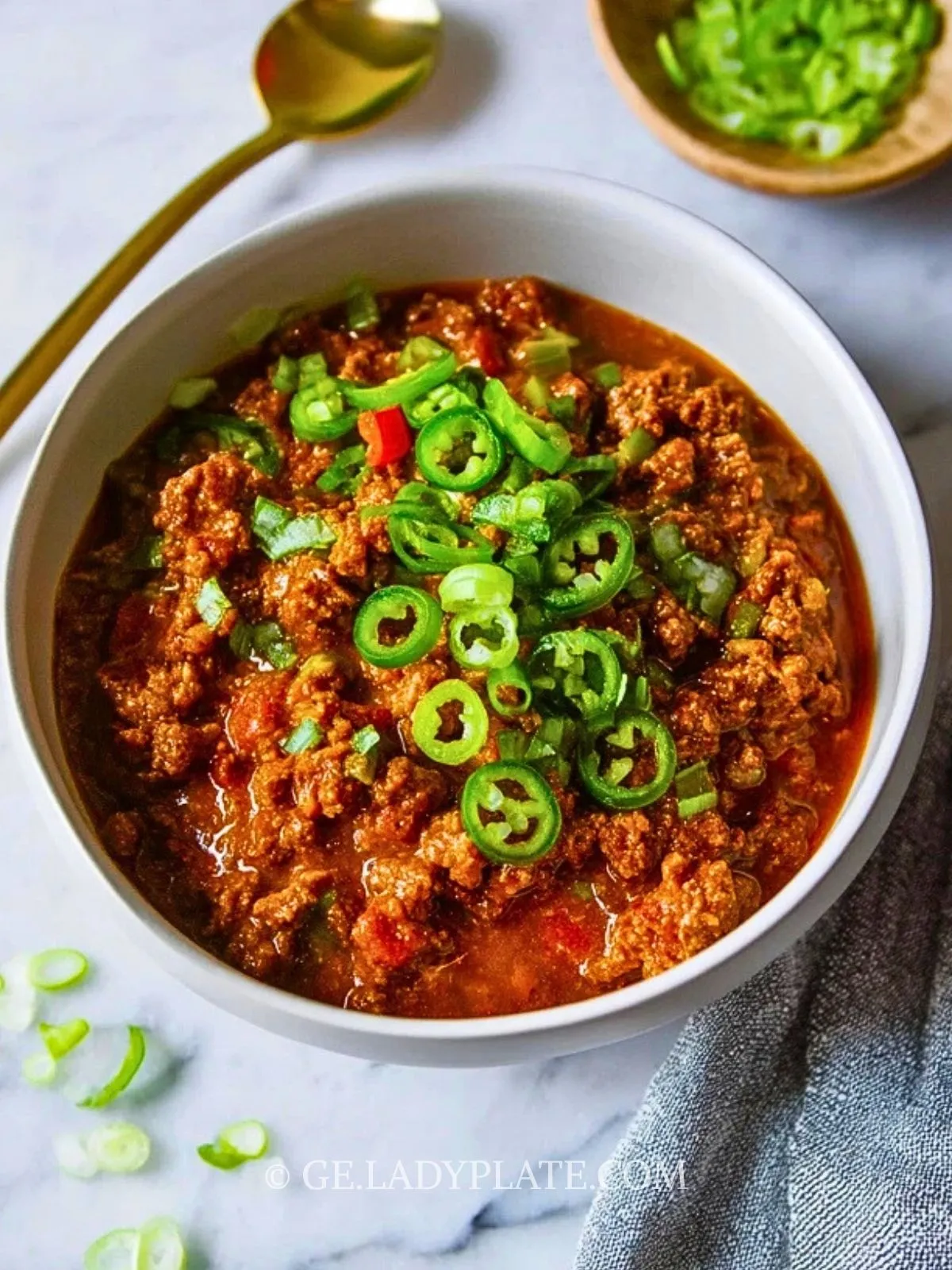 Ein würziges, herzhaftes Keto-Chili mit Rinderhack, Tomaten und aromatischen Gewürzen. Dieses einfache Rezept ist schnell gemacht, wunderbar sättigend und ideal für ein kohlenhydratarmes Mittag- oder Abendessen.