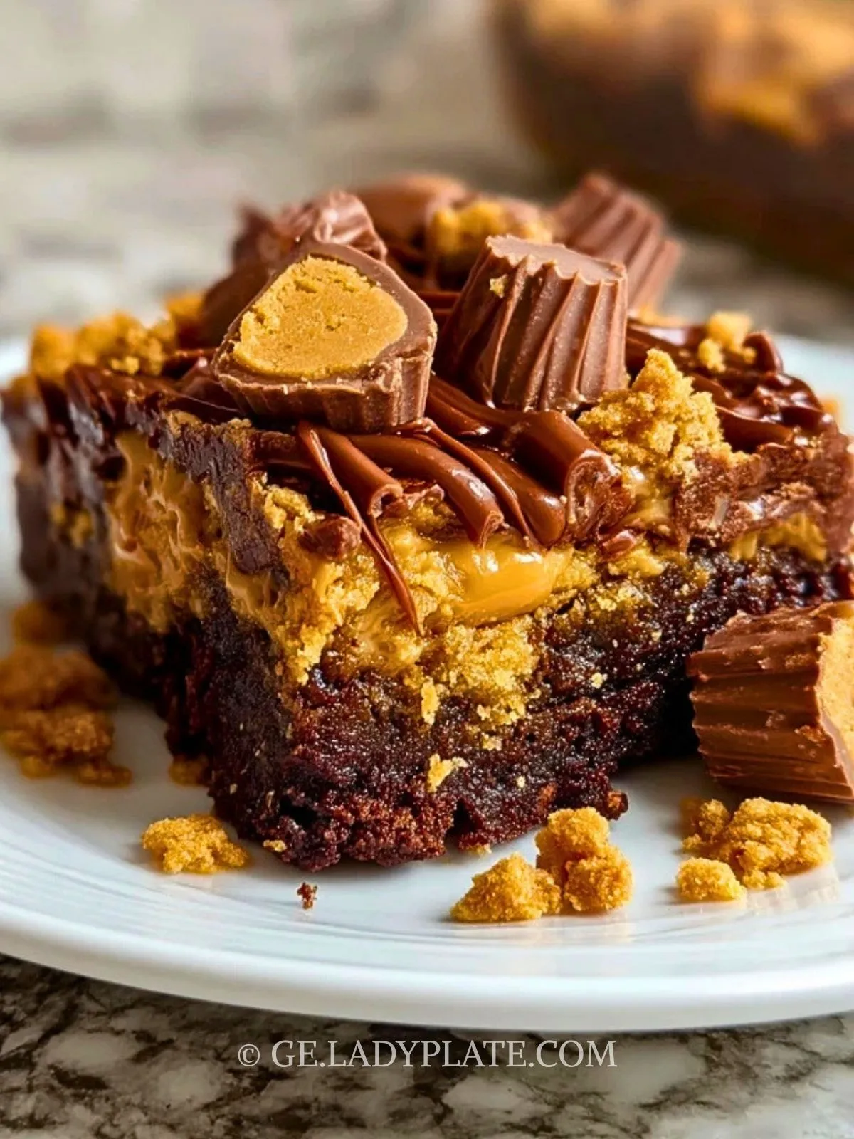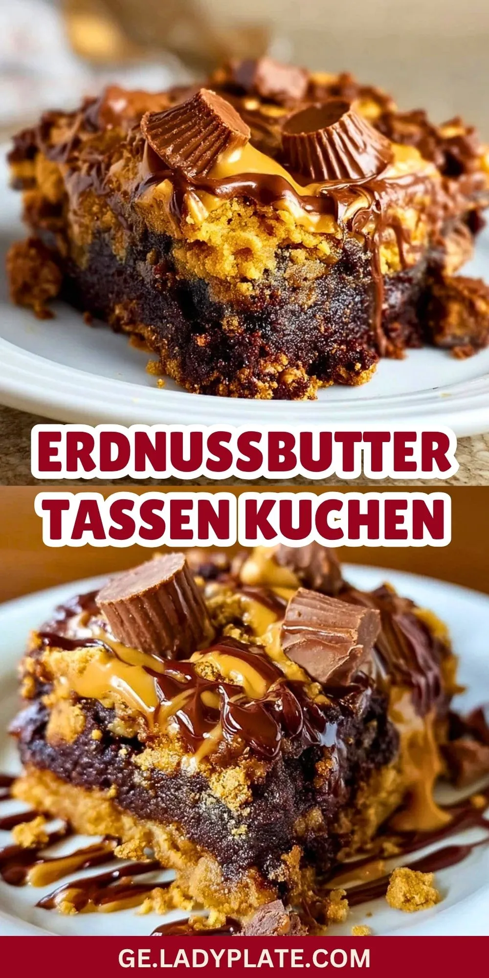 Saftiger Schokoladenteig, cremige Erdnussbutter, zartschmelzende Schokolade und kleine Stücke von Erdnussbutter-Tassen machen diesen Kuchen zu einem besonders üppigen Dessert. Er verbindet alles, was Fans von Schoko-Erdnussbutter-Kombinationen lieben: weiche Mitte, intensives Aroma und ein Topping, das schon optisch Lust auf das erste Stück macht.