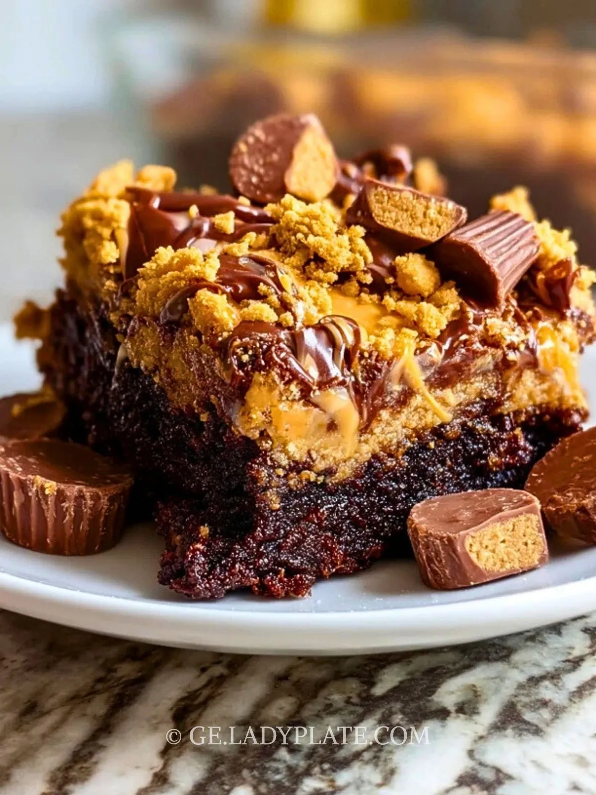 Für die Erdnussbutter-Schicht kommt cremige Erdnussbutter mit Puderzucker zusammen – so entsteht eine weiche, leicht süße Masse, die beim Backen eine köstliche Schicht bildet. Mini-Erdnussbutter-Täfelchen und Schokotropfen werden großzügig über den Teig gestreut und teilweise nach dem Backen zum Dekorieren verwendet, damit der Kuchen nicht nur traumhaft schmeckt, sondern auch richtig nach Schokodessert aussieht.