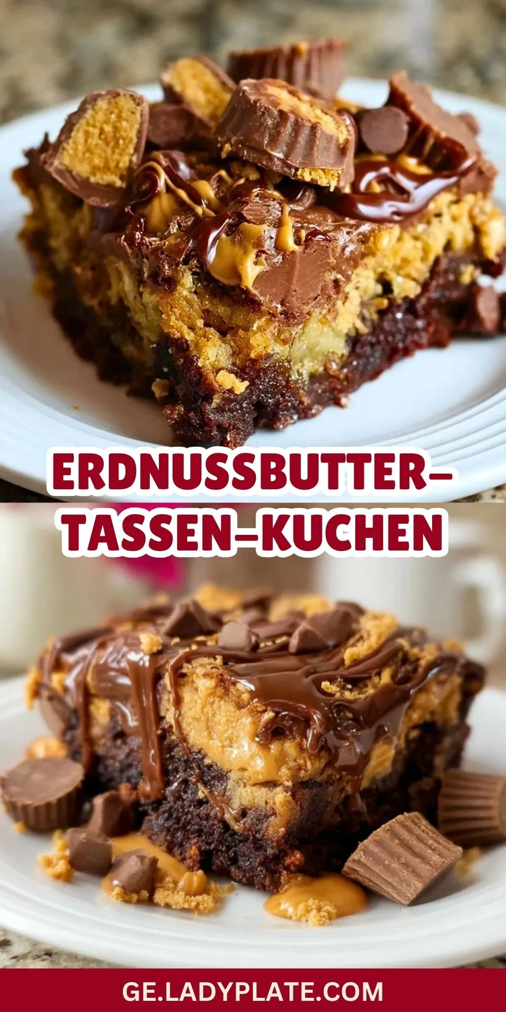 Dieser Erdnussbutter-Tassen-Kuchen kombiniert einen extra saftigen Schokobrownie mit einer cremigen Erdnussbutter-Schicht und vielen schmelzenden Erdnussbutter-Täfelchen – perfekt, wenn du schnell ein dekadentes Blechdessert für Schokofans servieren möchtest.