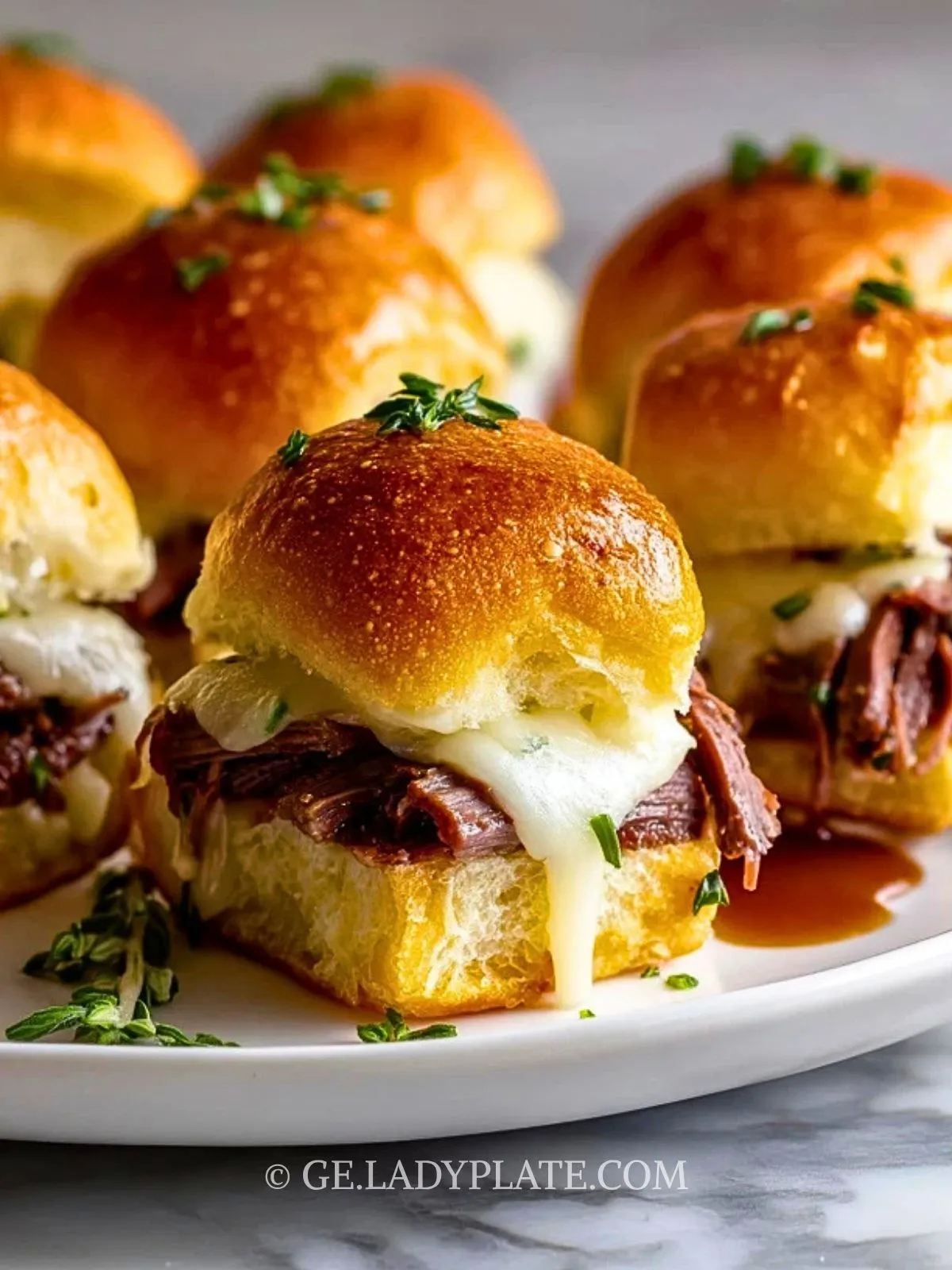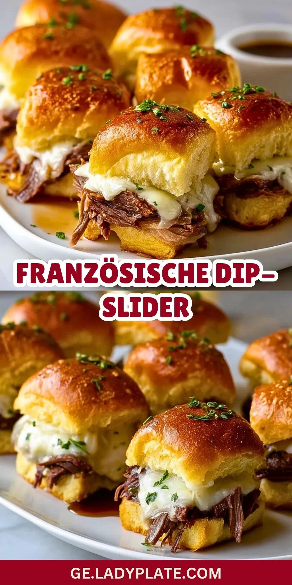 Keywords: Französische Dip-Slider, French Dip Sliders, Rindfleisch-Slider, Partyrezept, Ofensandwich