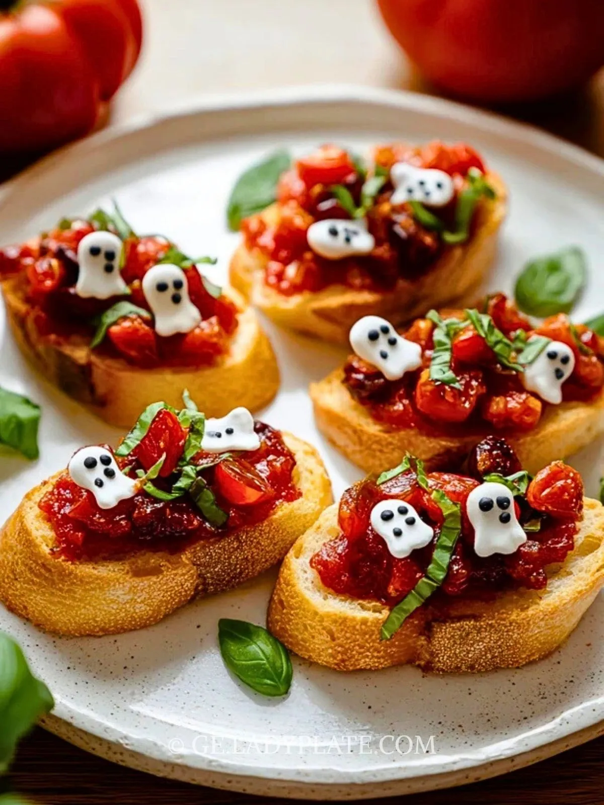Diese Gespenster-Bruchetta sind knusprige Baguette-Häppchen mit würziger Tomaten-Käse-Schicht und einem cremigen Gespenster-Gesicht – der perfekte herzhafte Halloween-Snack für Groß und Klein.