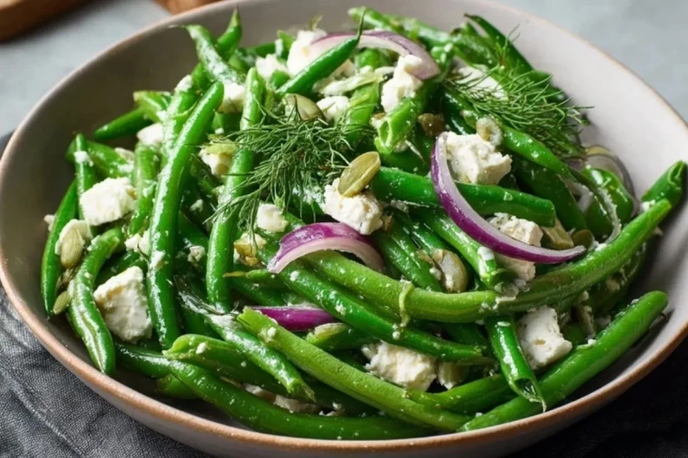 Frischer, knackiger Bohnen-Feta-Salat mit roten Zwiebeln, Kürbiskernen und aromatischem Zitronen-Olivenöl-Dressing. Perfekt als sommerliche Beilage oder leichtes Hauptgericht!