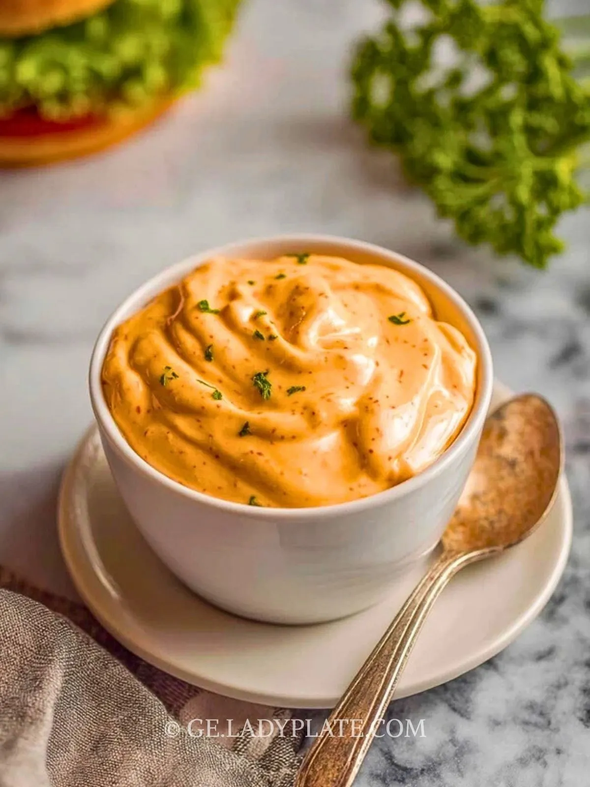 Rühre die Sauce vor dem Servieren noch einmal kurz durch. Verwende sie großzügig auf Burger-Brötchen, als Dip zu Pommes oder Kartoffelspalten oder zu gegrilltem Gemüse und Chicken Nuggets.