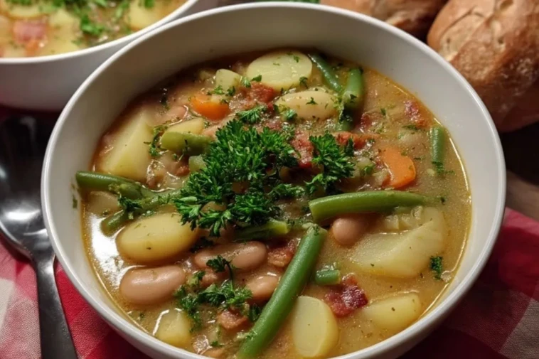 Eine dampfende Schale Bohnensuppe weckt Erinnerungen an Großmutters Küche – herzhaft, bodenständig und voller Geschmack. Diese klassische deutsche Bohnensuppe vereint zarte weiße Bohnen, knackige grüne Bohnen, Kartoffeln, Möhren und würzigen Speck zu einem wärmenden Eintopf, der besonders an kalten Tagen für Wohlbefinden sorgt. Jede Portion ist reich an Aroma und steckt voller gesunder Zutaten aus dem Garten.