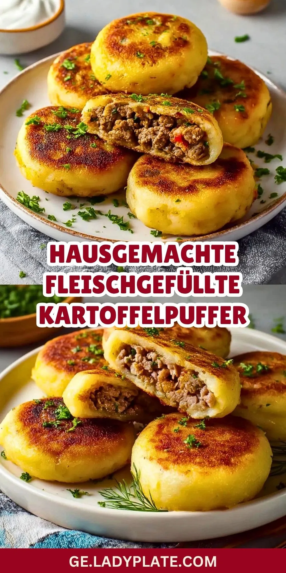 Außen goldbraun und knusprig, innen weich und herzhaft gefüllt – hausgemachte fleischgefüllte Kartoffelpuffer sind ein wunderbar sättigendes Wohlfühlgericht für die ganze Familie. Die Kombination aus cremigem Kartoffelteig und würziger Fleischfüllung sorgt für einen rustikalen Geschmack, der sowohl im Alltag als auch am Wochenende begeistert.