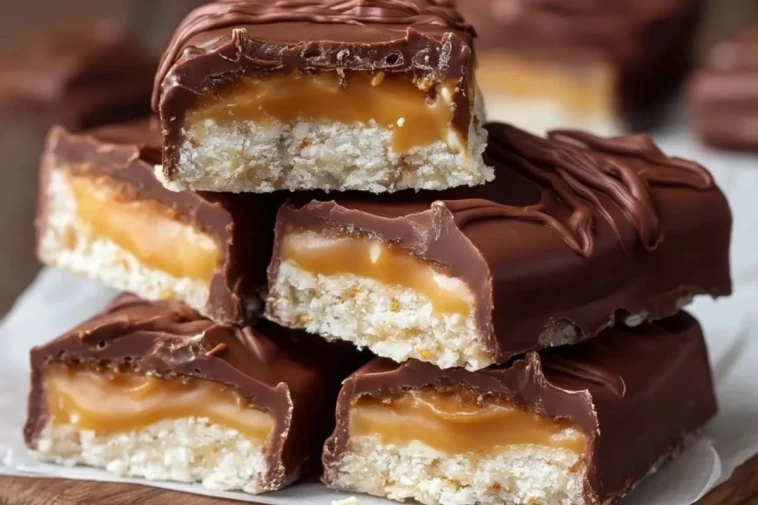 Diese hausgemachten Schokoladenriegel mit Karamell und Nougat bestehen aus einer zarten Keks-Kokos-Basis, einer cremigen Nougatschicht, weichem Karamell und einem glatten Schokoladenüberzug. Das Rezept ist ideal für besondere Anlässe, als süßes Geschenk oder für den Vorrat im Kühlschrank, wenn du Lust auf einen selbstgemachten Schokoriegel hast.