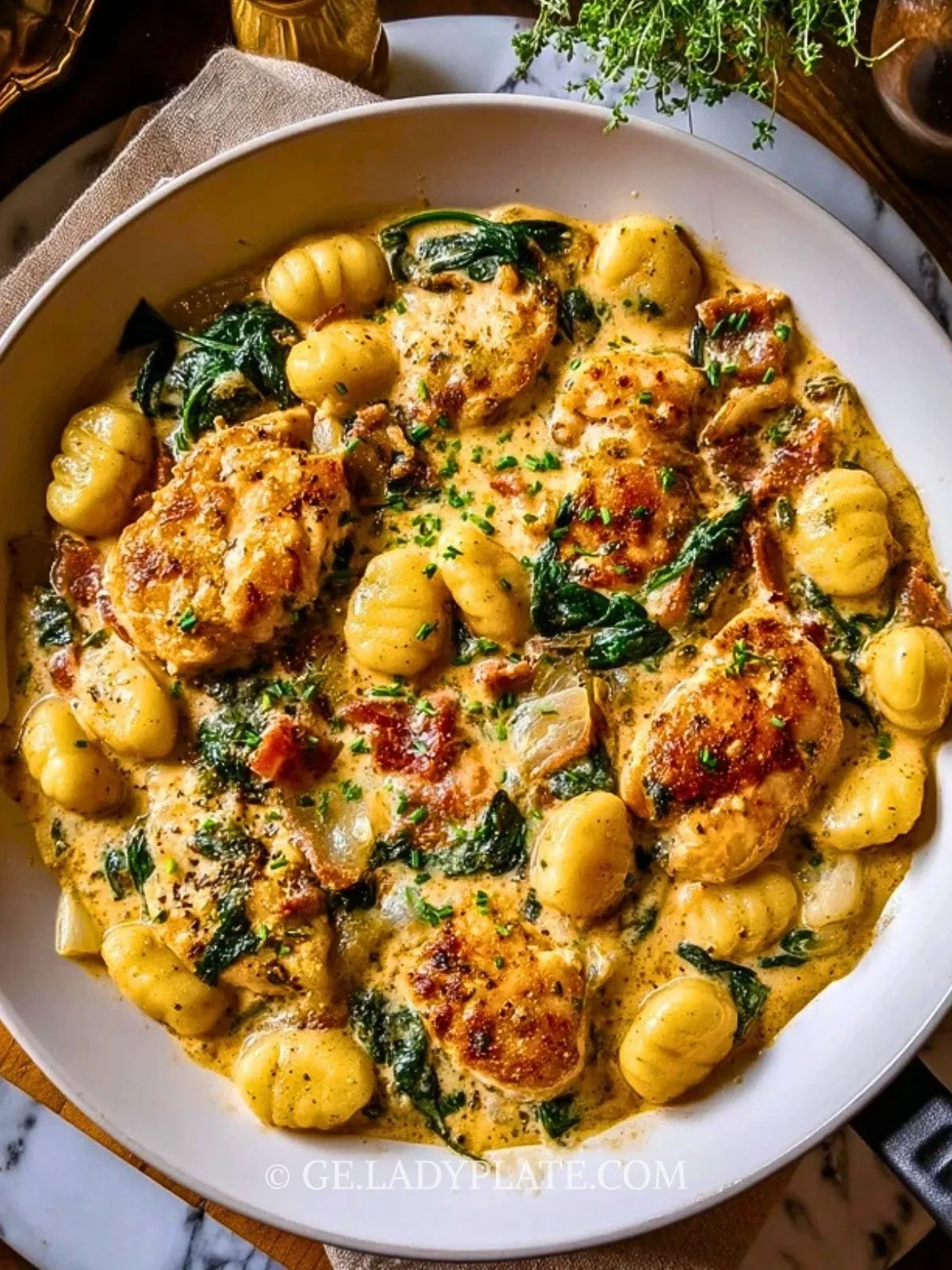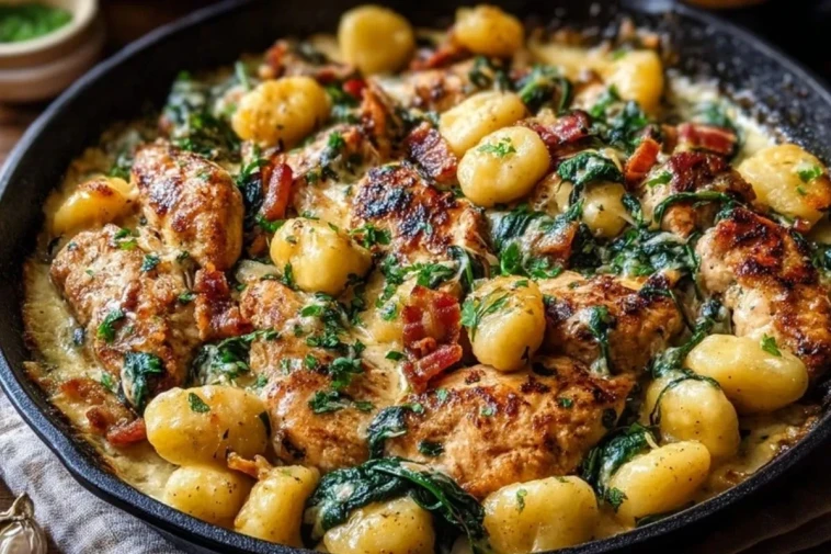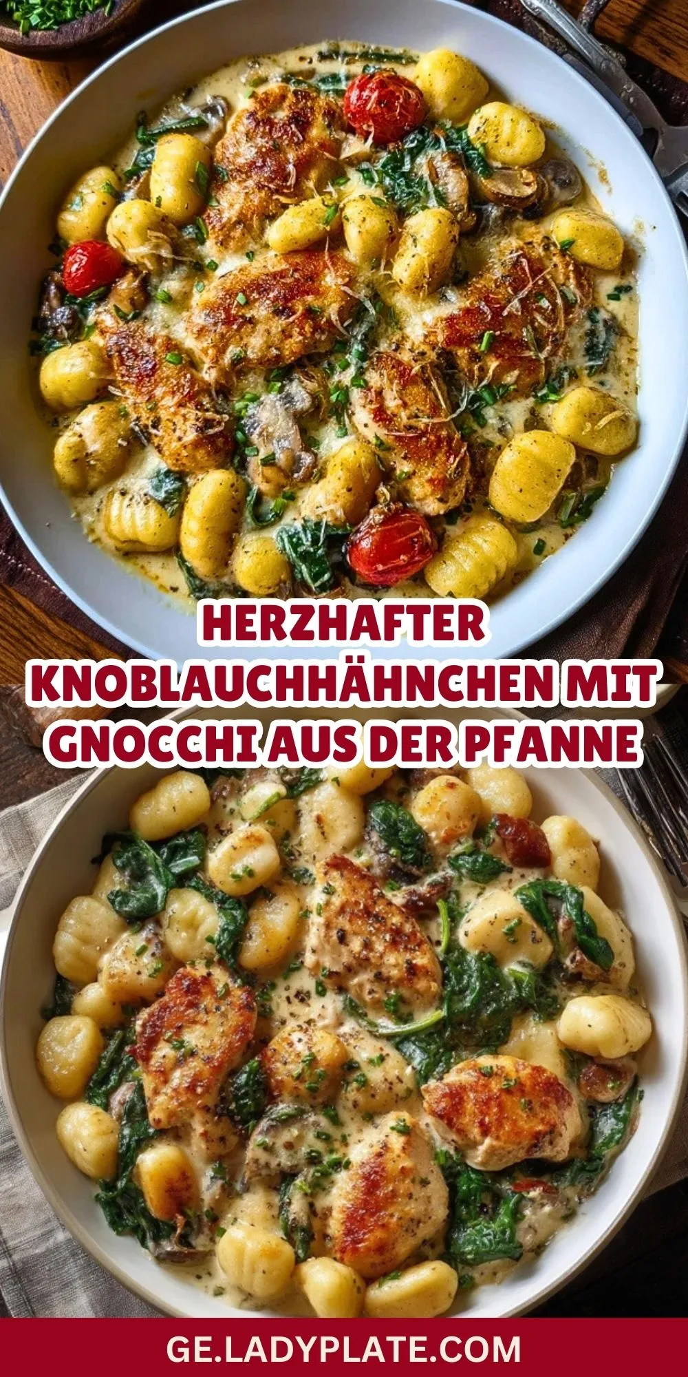 Wenn es draußen ungemütlich wird, ist eine cremige Pfanne mit zartem Hähnchen, Knoblauchduft und goldenen Gnocchi genau das Richtige. Dieses Gericht vereint alles, was wir an herzhaften Wohlfühlrezepten lieben: knusprig angebratenes Fleisch, kleine Kartoffelklößchen, die sich in eine sahnige Sauce kuscheln, und dazu etwas frischer Spinat für Farbe und Frische.