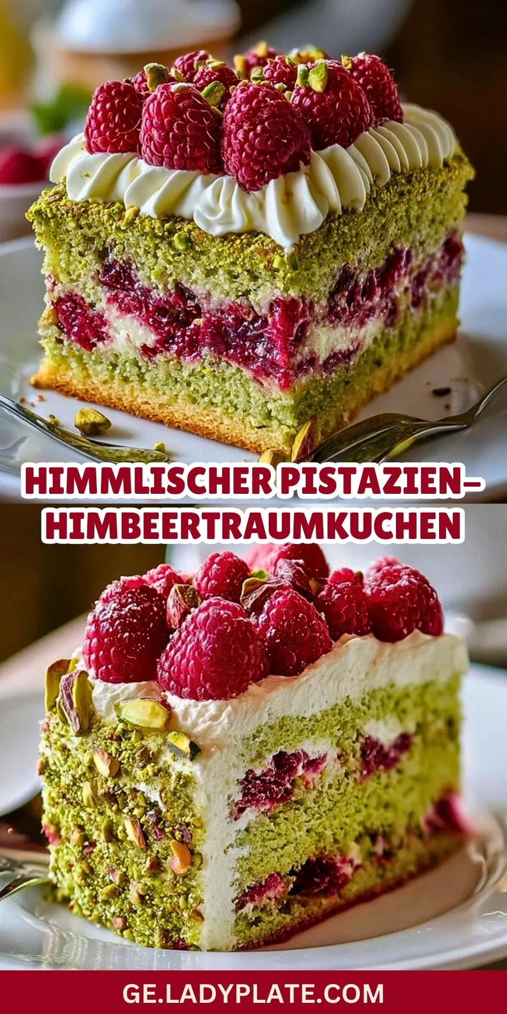 Ein Kuchen wie aus dem Märchen: Der Himmlische Pistazien-Himbeertraumkuchen vereint zarte Pistazienböden, frische Himbeeren und eine luftige Creme zu einer herrlich fruchtigen und nussigen Versuchung. Jeder Bissen überrascht mit saftigem, leicht grünem Teig und dem süß-säuerlichen Aroma der Beeren, während die Pistazien für einen feinen Crunch sorgen.