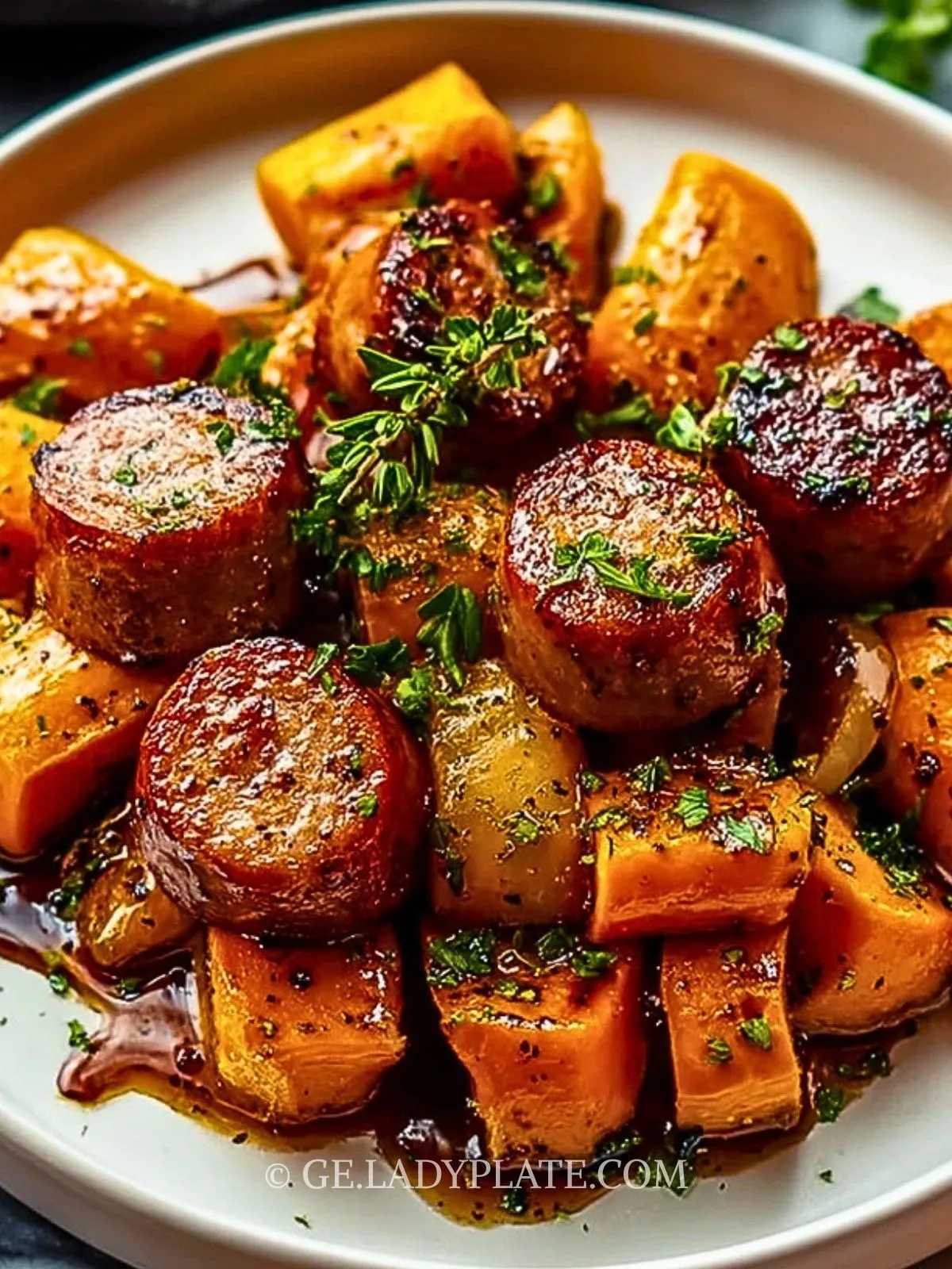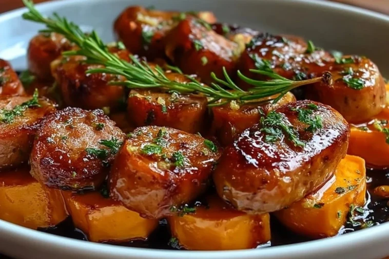 So bereitest du Honig-Knoblauch-Wurst mit Süßkartoffeln zu