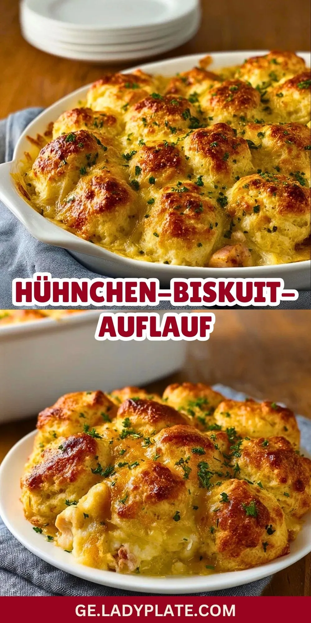 Ein saftiger Hühnchen-Biskuit-Auflauf mit lockeren Biskuit-Teigstücken, goldener Käsekruste und cremiger Sauce – ein perfektes Familienessen, das Groß und Klein begeistert. Schnell zubereitet und wunderbar variabel!