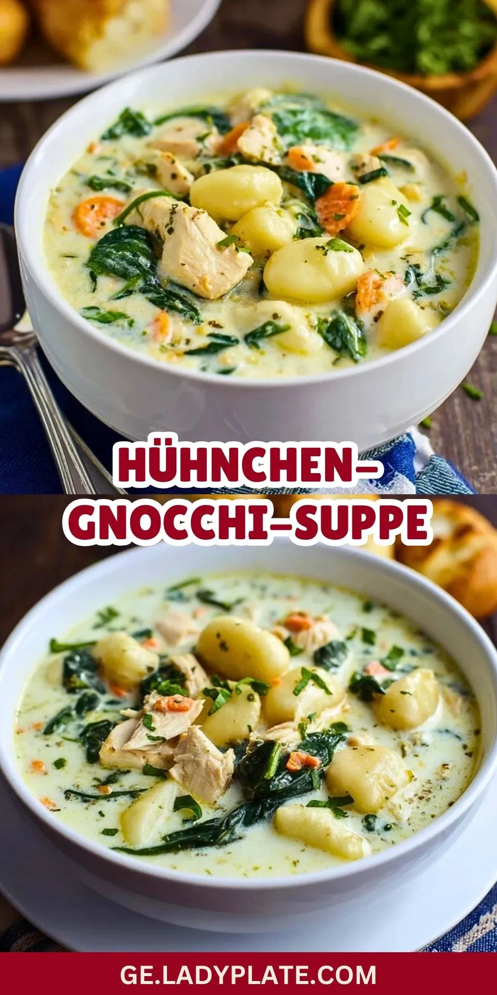 Diese Hühnchen-Gnocchi-Suppe ist herrlich cremig, herzhaft und vollgepackt mit zartem Hähnchen, Gnocchi, frischem Gemüse und Spinat. Sie wärmt an kalten Tagen, ist unkompliziert in der Zubereitung und begeistert die ganze Familie.