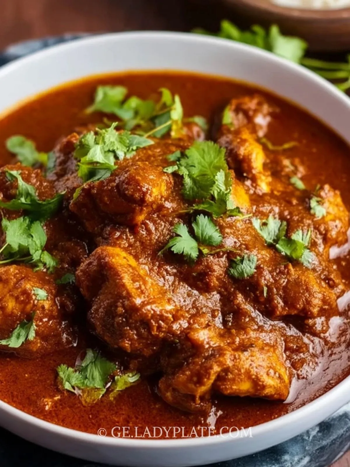 Das Lorbeerblatt entfernen. Hühnchen Rogan Josh auf Tellern anrichten, mit frisch gehacktem Koriander bestreuen und zusammen mit heißem Basmatireis servieren.