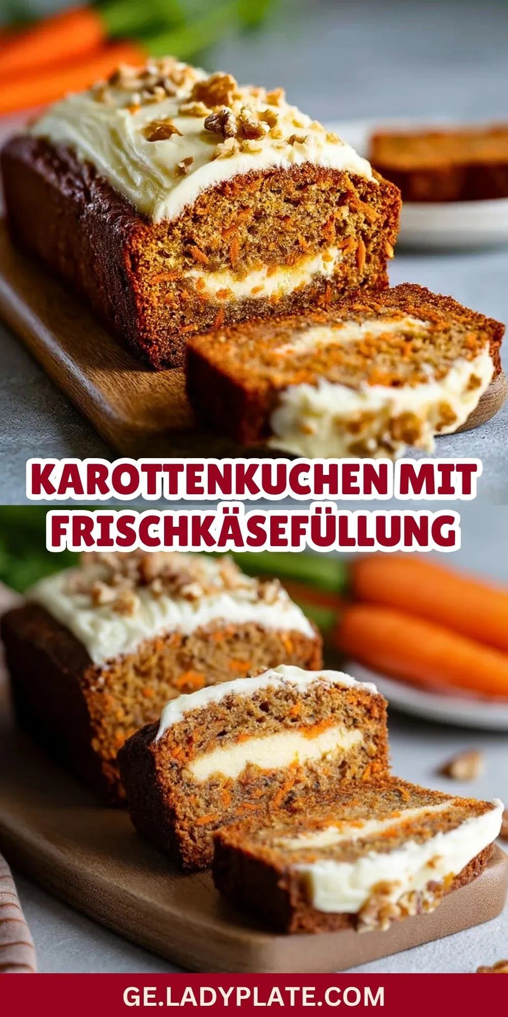 Besonders schön an diesem Rezept ist der Kontrast der Texturen: außen goldbraun gebacken, innen weich und aromatisch, dazwischen eine sanfte Frischkäsefüllung, die beim Anschneiden sofort ins Auge fällt. Ob zum Osterbrunch, für den Sonntagskaffee oder als besonderer Blech- oder Kastenkuchen für Gäste – dieser Karottenkuchen bleibt in Erinnerung.