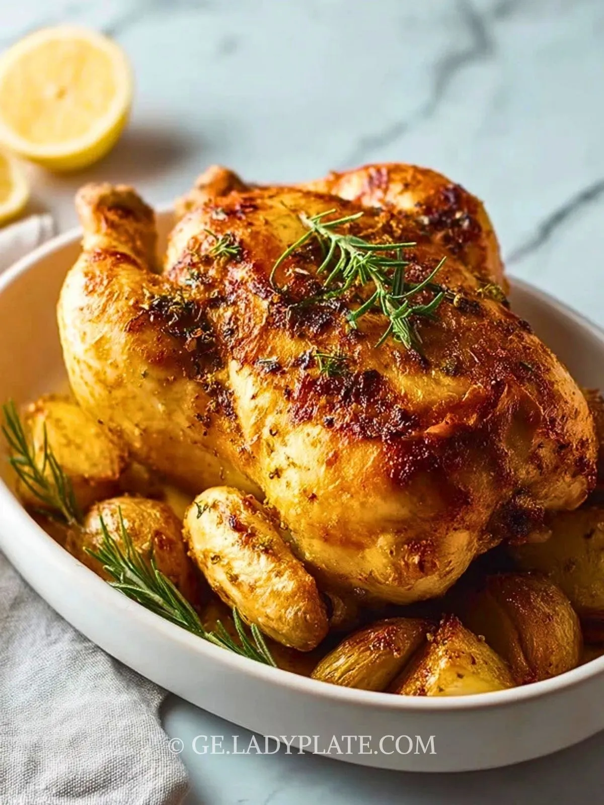 Richte das Brathähnchen auf einer Platte mit den gerösteten Kartoffeln, Zitronenspalten und etwas frischem Rosmarin an. Ein wenig Bratensaft darüber macht das Gericht besonders aromatisch.