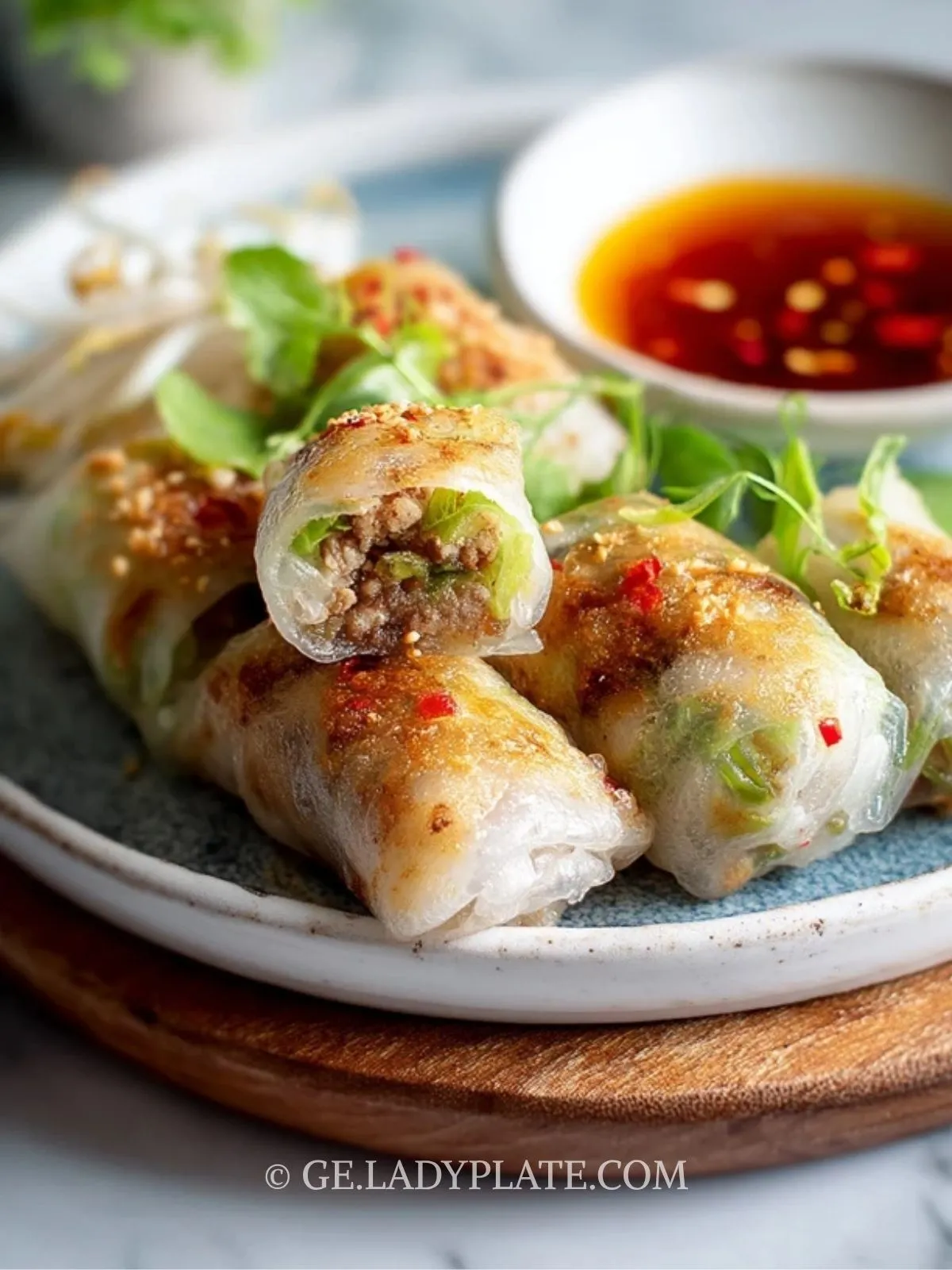 Diese knusprigen Reisteig-Wasabi-Dumplings mit Putenfüllung verbinden feine Schärfe, saftige Fülle und eine herrlich zarte Hülle mit goldbraunem Biss. Der Reisteig sorgt für eine leicht elastische, fast seidige Textur, während die Putenfüllung angenehm herzhaft bleibt und durch Gemüse, Gewürze und einen Hauch Wasabi wunderbar lebendig wirkt.