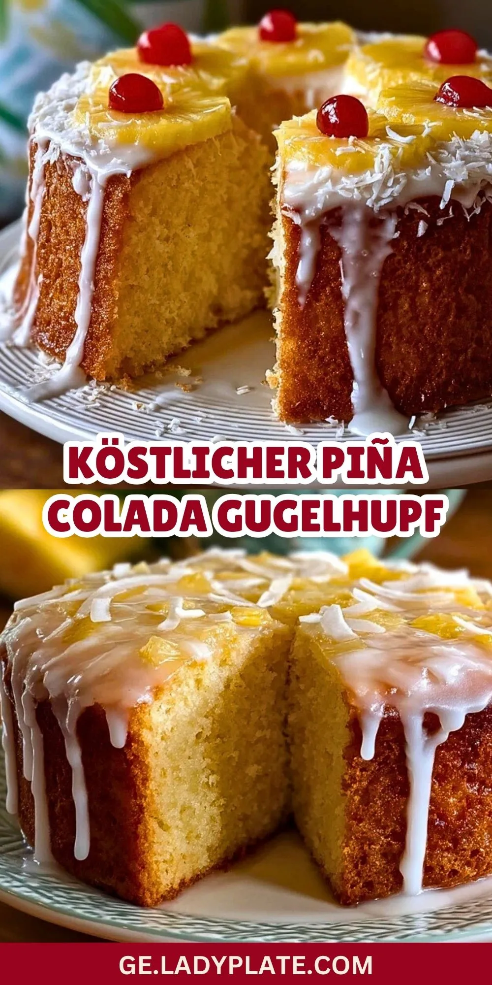 Ein fluffiger, saftiger Gugelhupf, inspiriert vom tropischen Cocktail-Klassiker Piña Colada: Mit Kokos, Ananas, Rum (oder ohne), einer herrlich frischen Glasur und dekorativen Ananasringen. Perfekt für jeden Anlass, bleibt tagelang saftig und begeistert jeden Kuchenfan!