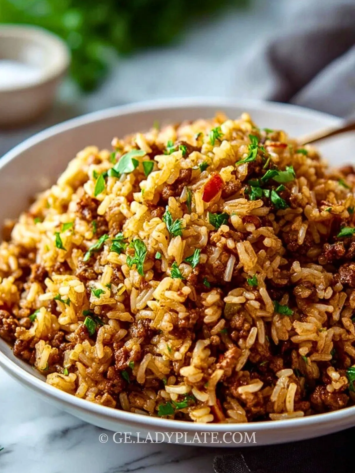 Den schmutzigen Reis mit fein geschnittenen Frühlingszwiebeln und frischer Petersilie bestreuen. Sofort servieren und genießen!