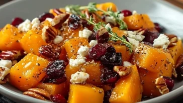 Honiggerösteter Butternut-Kürbis mit Cranberries, Pekannüssen und Feta