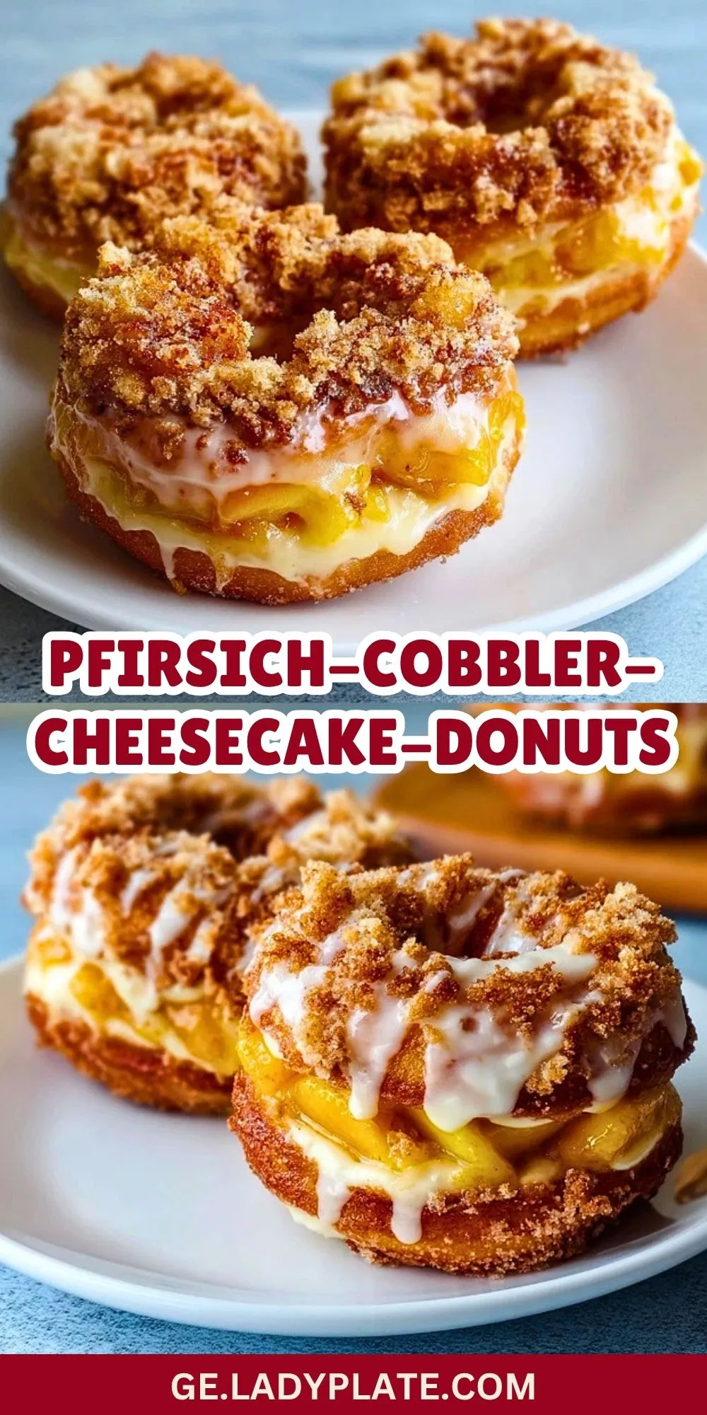 Keywords: Pfirsich-Cobbler-Cheesecake-Donuts, Donuts mit Pfirsich, Cheesecake Donuts, Dessert mit Pfirsichen