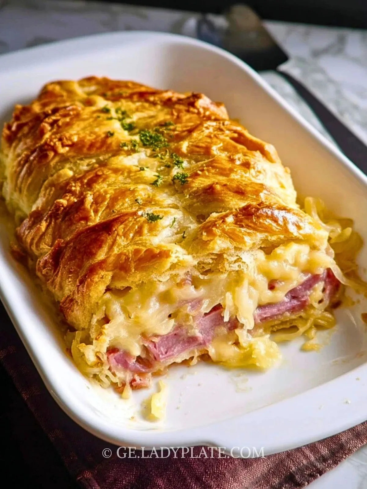 Ein knuspriger Blätterteigstrudel mit einer herzhaften Füllung aus Schinken, Sauerkraut, würzigem Käse und cremigem Dressing. Perfekt als deftiges Abendessen oder auf dem Partybuffet – einfach vorzubereiten und unwiderstehlich lecker!