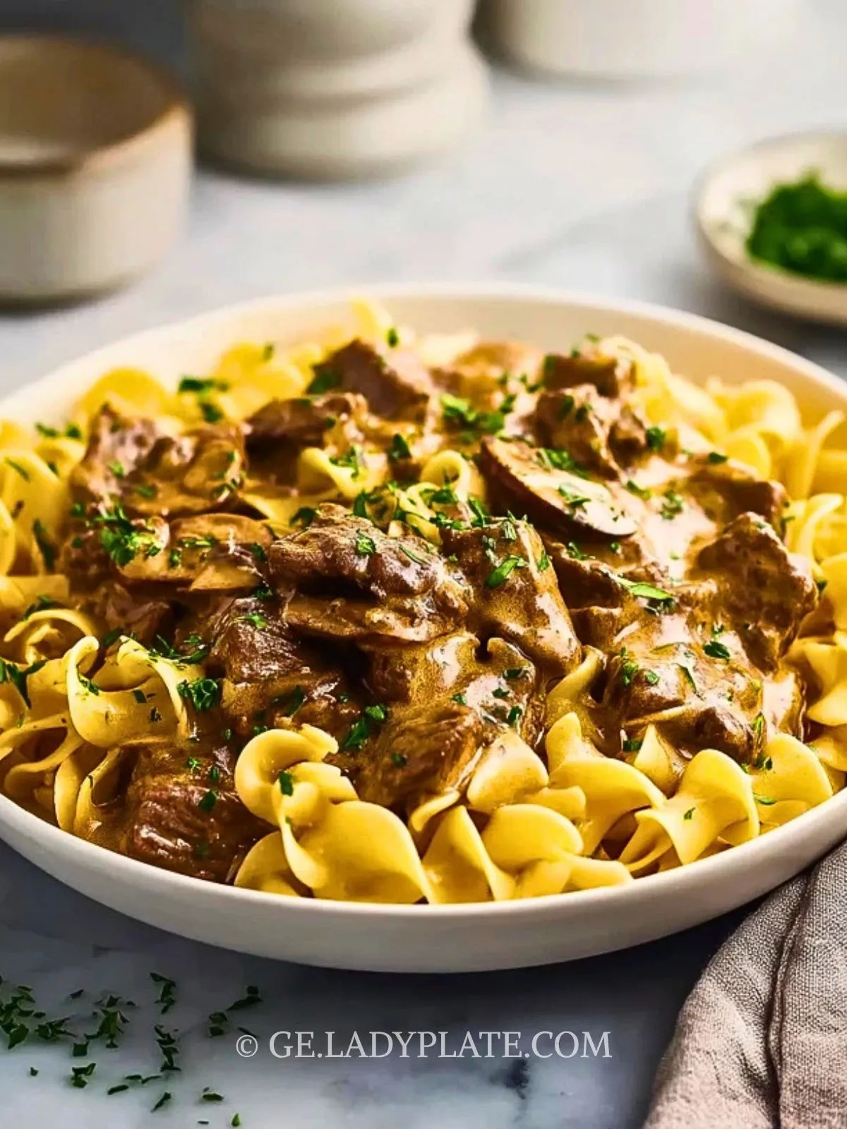 Koche währenddessen die Bandnudeln nach Packungsanweisung. Richte sie mit dem cremigen Rinderstroganoff an und streue zum Schluss frisch gehackte Petersilie darüber.