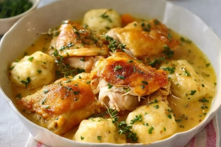 Dieses Gericht kombiniert zartes Hähnchen, das in der Pfanne angebraten und dann in einer cremigen Brühe gegart wird, mit Knödeln, die herrlich locker und aromatisch sind. Frische Kräuter runden das Geschmackserlebnis ab und machen die Mahlzeit zu einem echten Wohlfühlessen.