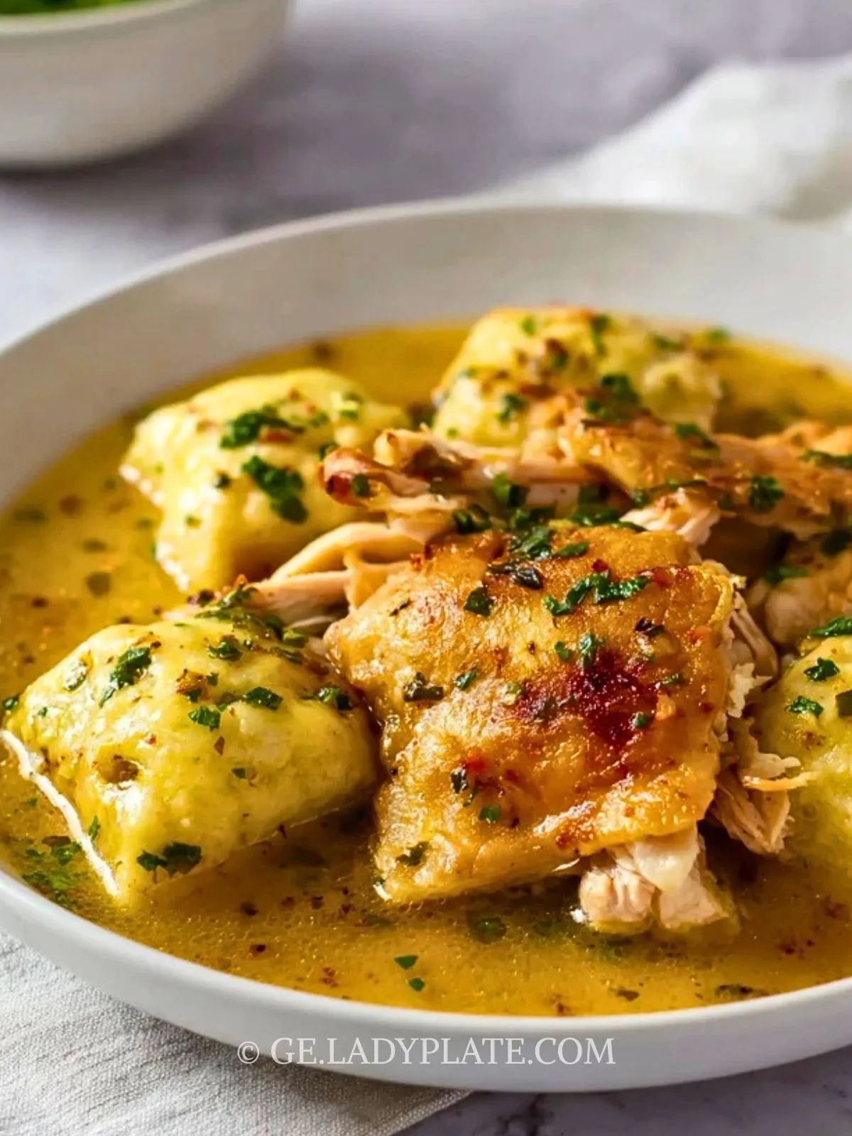 6. Hähnchen mit Knödeln und frischen Kräutern bestreut servieren.