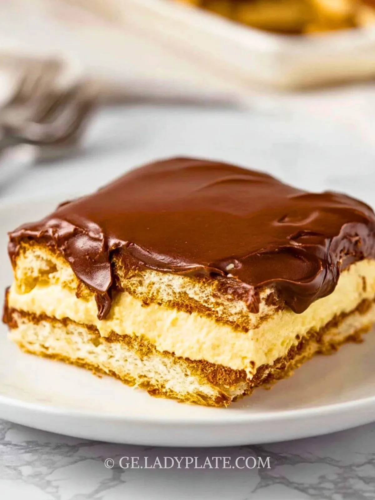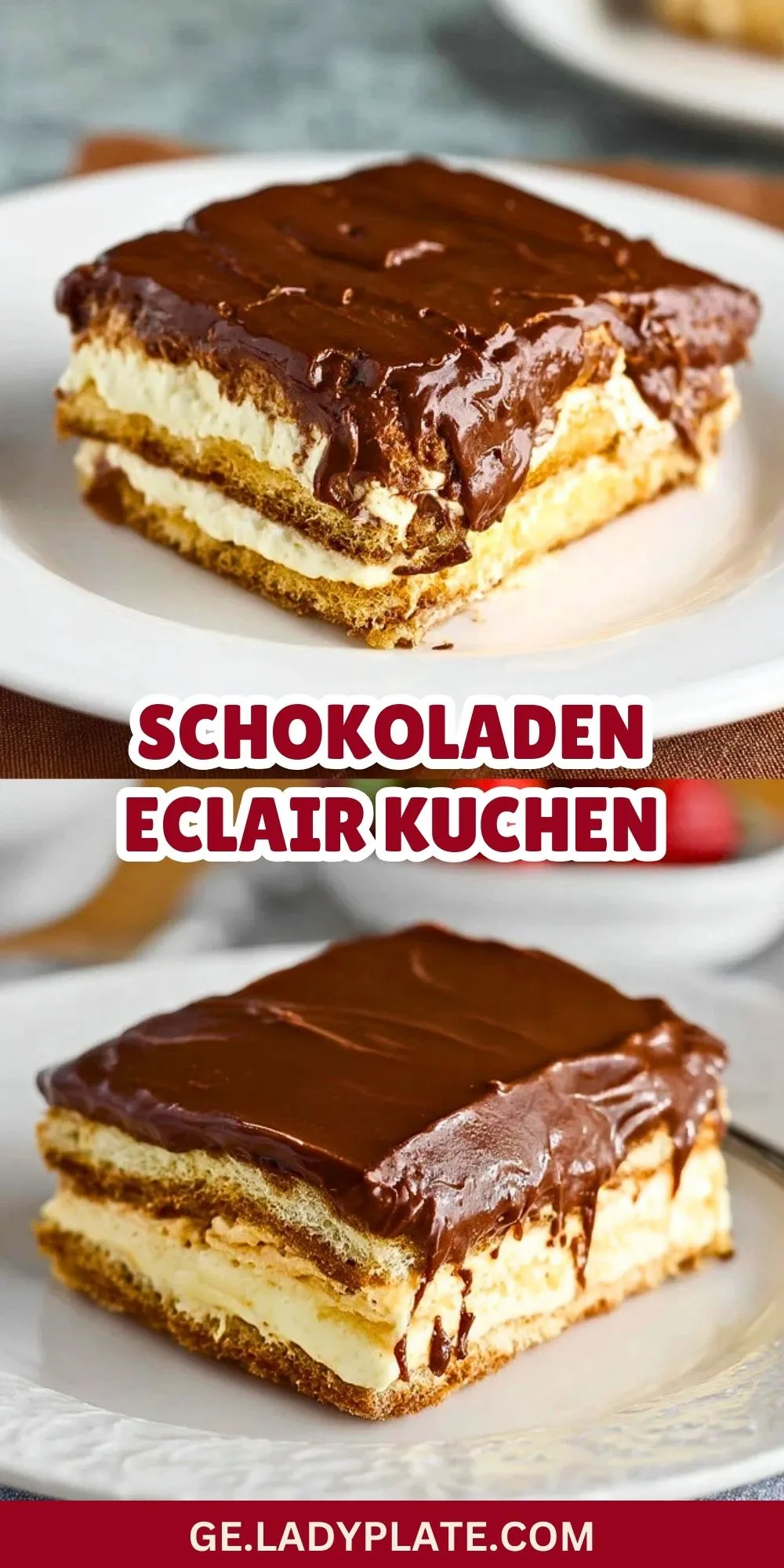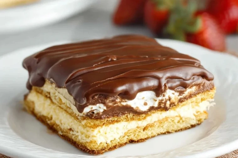 Ein himmlisch cremiger Schokoladen Eclair Kuchen mit Butterkeksschichten, fluffiger Vanillecreme und zarter Schokoglasur. Perfekt für jeden Anlass, ganz ohne Backen – einfach vorzubereiten und unglaublich lecker!