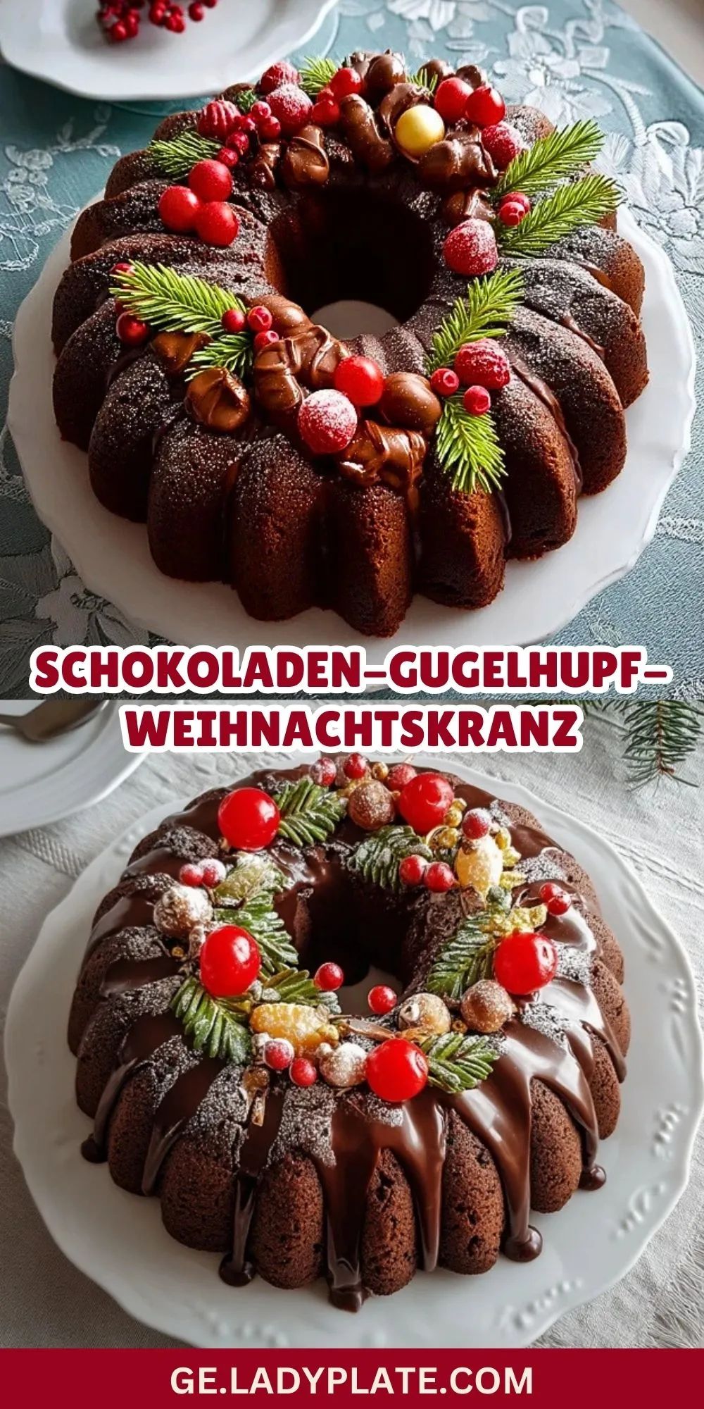 Die Basis ist ein aromatischer Rührteig mit Kakao, Zimt und einem Hauch Orangenschale – genau die Aromen, die man mit der Weihnachtszeit verbindet. Der Gugelhupf wird nach dem Backen mit einer üppigen Schokoglasur überzogen und anschließend wie ein Kranz dekoriert. So entsteht ein Dessert, das nicht nur köstlich schmeckt, sondern auch direkt als essbare Tischdekoration dient.