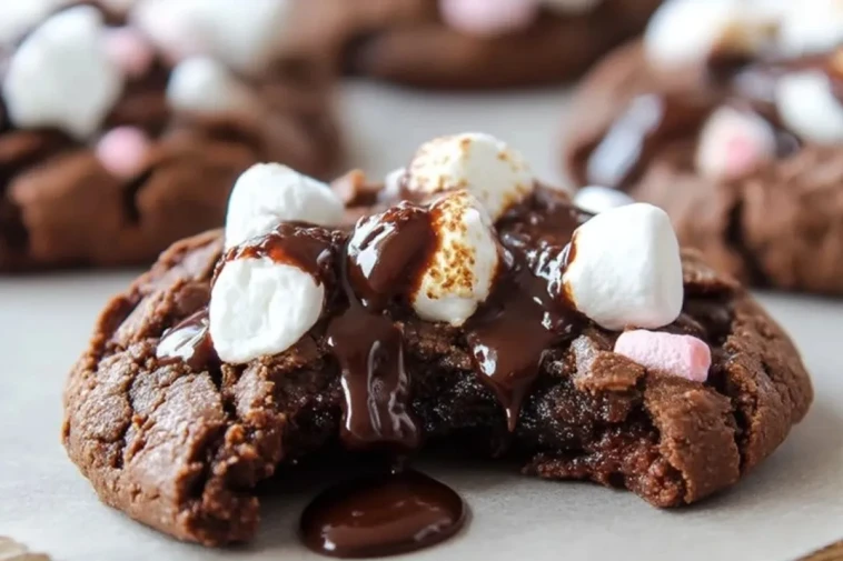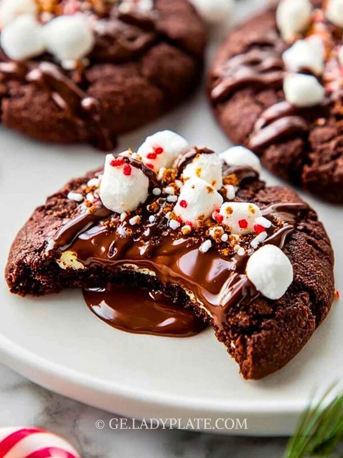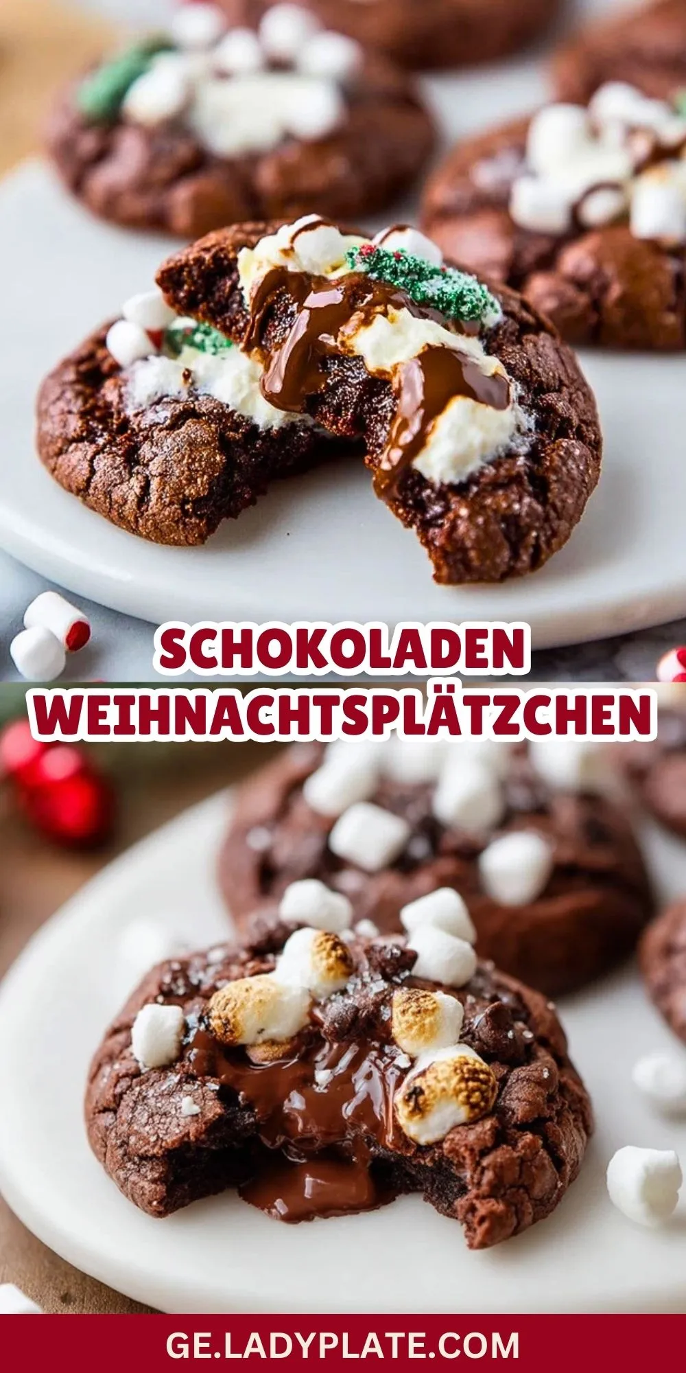 Diese Schokoladen-Weihnachtsplätzchen mit Marshmallows verbinden einen weichen, fudgy Schokokern mit geschmolzener Schokosauce und fluffigen Mini-Marshmallows – perfekte kleine Hot-Chocolate-Kekse für gemütliche Winterabende.